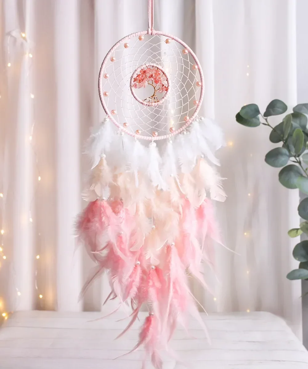 Attrape – rêves en tourmaline noire et rose avec plumes