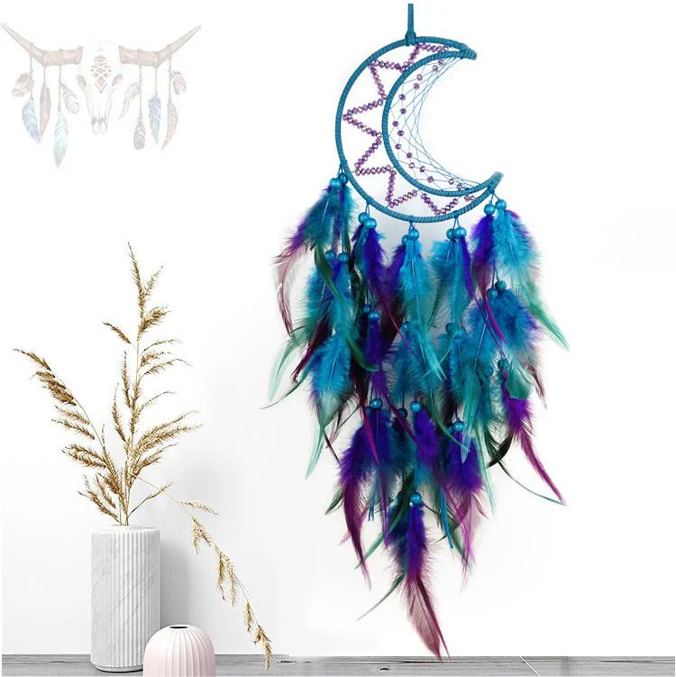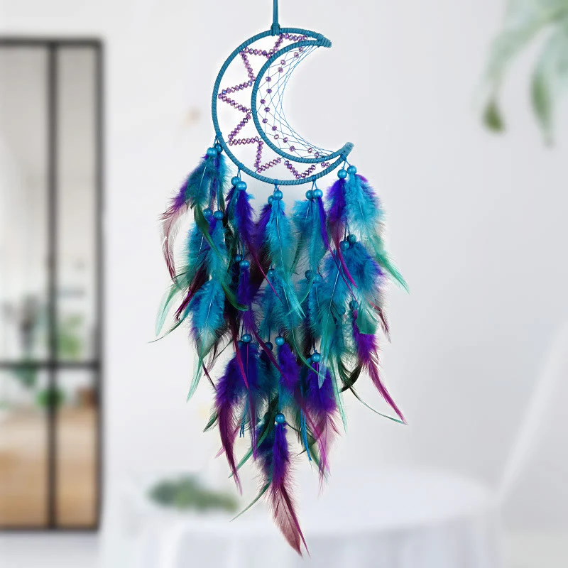 Attrape-rêves indien en forme de croissant avec pierres précieuses brutes et plumes