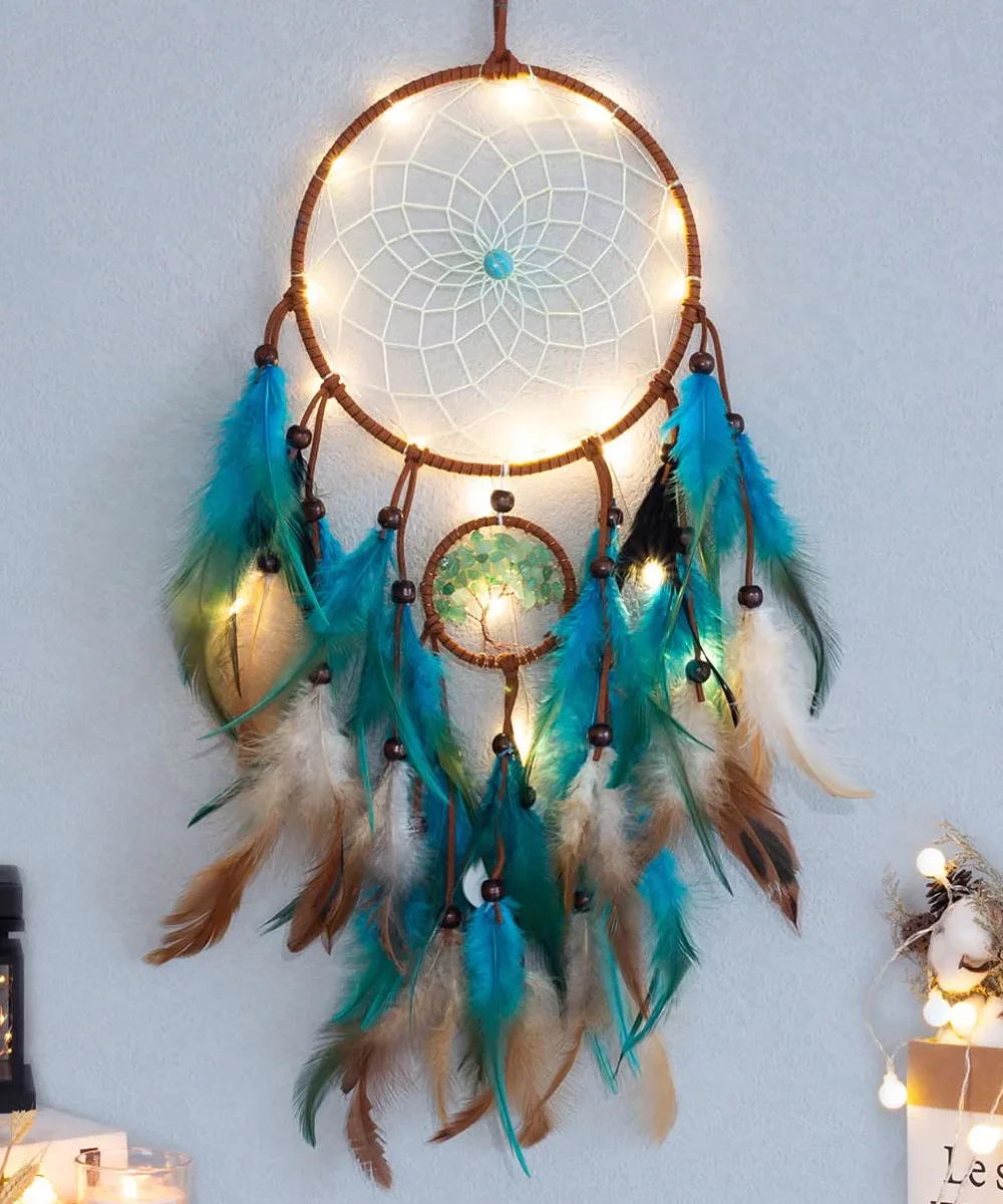 Attrape-rêves en plumes de paon fait main avec perles phosphorescentes Olivenorma