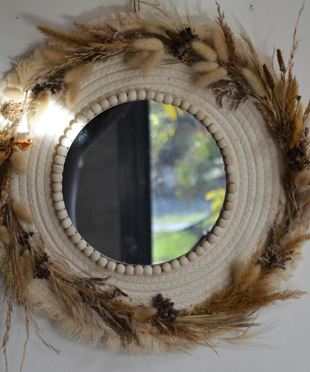 Miroir champêtre en macramé blanc et fleurs sechées.