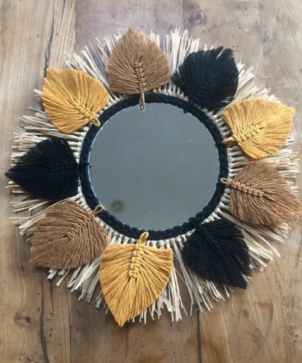 Miroir en raphia naturel et feuilles en coton macramé (différents coloris au choix)