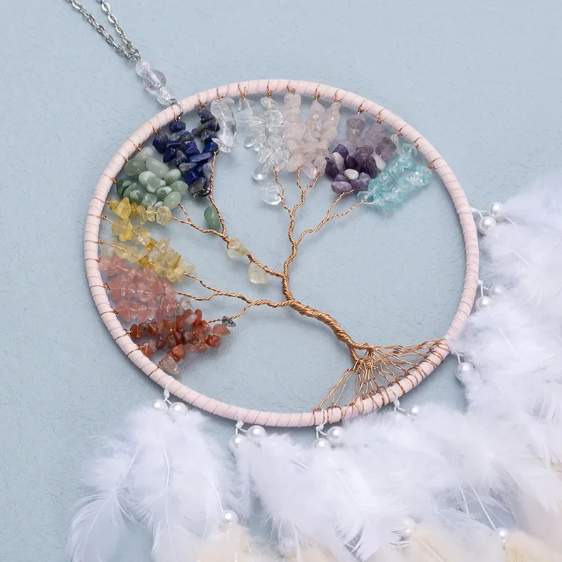 L’Attrape Rêve Arbre de vie des 7 Chakras est une pièce exceptionnelle qui allie spiritualité et beauté. Le motif central de l’arbre de vie, orné de pierres représentant les 7 chakras, symbolise l’équilibre et l’harmonie des énergies. Les plumes délicates dans des tons de blanc, rose et beige ajoutent une touche de douceur et de sérénité, parfaite pour créer une atmosphère apaisante dans votre intérieur. Idéal pour une chambre, un salon ou un espace de méditation, cet attrape rêve de Chakras est conçu pour favoriser la tranquillité et le bien-être. Fabriqué avec des matériaux de haute qualité, il est durable et esthétique, prêt à embellir n’importe quel espace tout en apportant une énergie positive. Laissez-vous inspirer par la beauté et la signification profonde de cet attrape rêve des 7 Chakras.