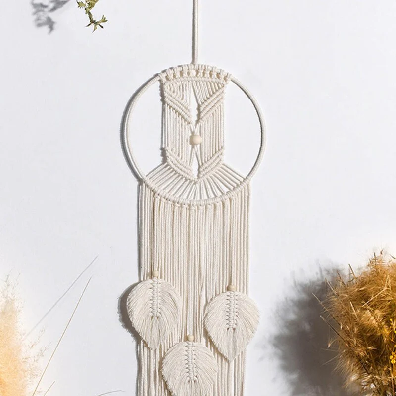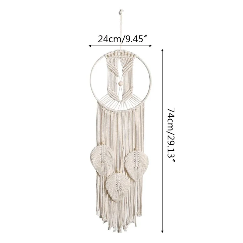 Laisse-toi envoûter par ce magnifique attrape-rêves aux plumes faites de macramé et apaise ton sommeil grâce à ses légendaires vertus protectrices. Ses trois plumes en macramé s’accordent parfaitement avec le style chic et bohème du capteur de rêves. Cette décoration d’intérieur apporte un vent frais et naturel dans ton salon, bureau ou chambre à coucher !