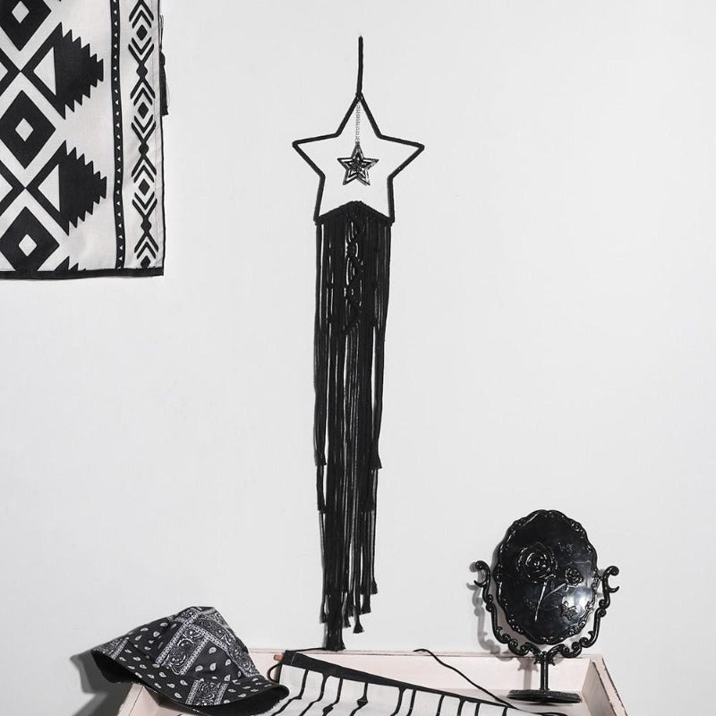 Craquez pour notre réinterprétation minimaliste et moderne de l’attrape rêve en tressage. Avec son tissage noir il tranchera dans votre décoration pour une originalité réelle. Avec son tissage en coton fait à la main et son petit cristal noir décoratif c’est une pièce unique qui n’attend qu’à être accrochée pour embellir votre intérieur.