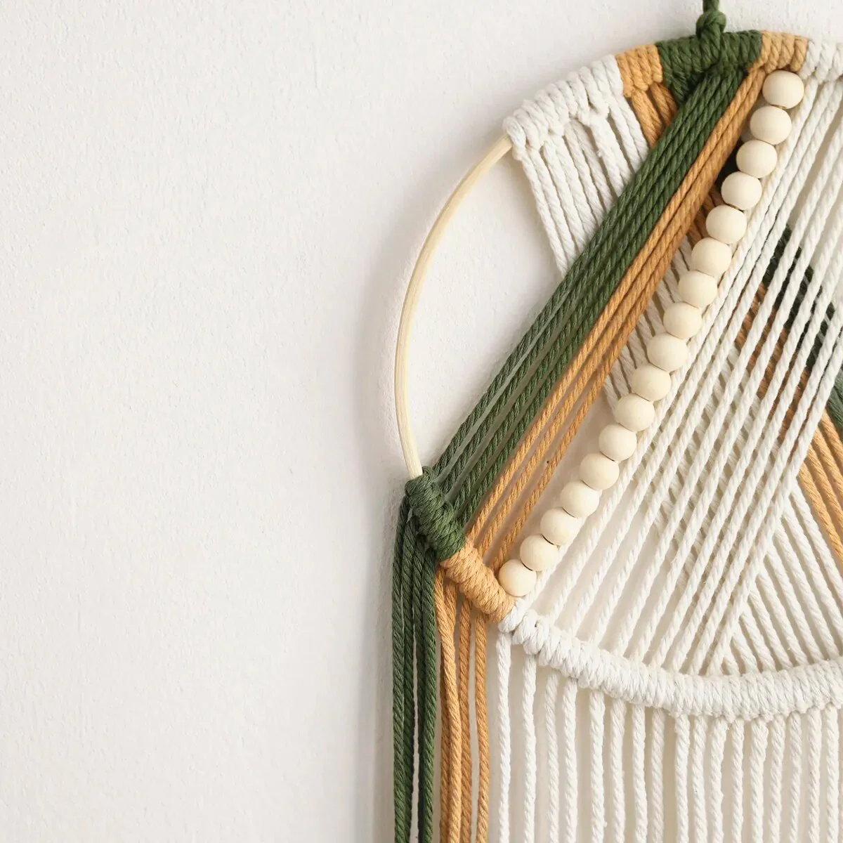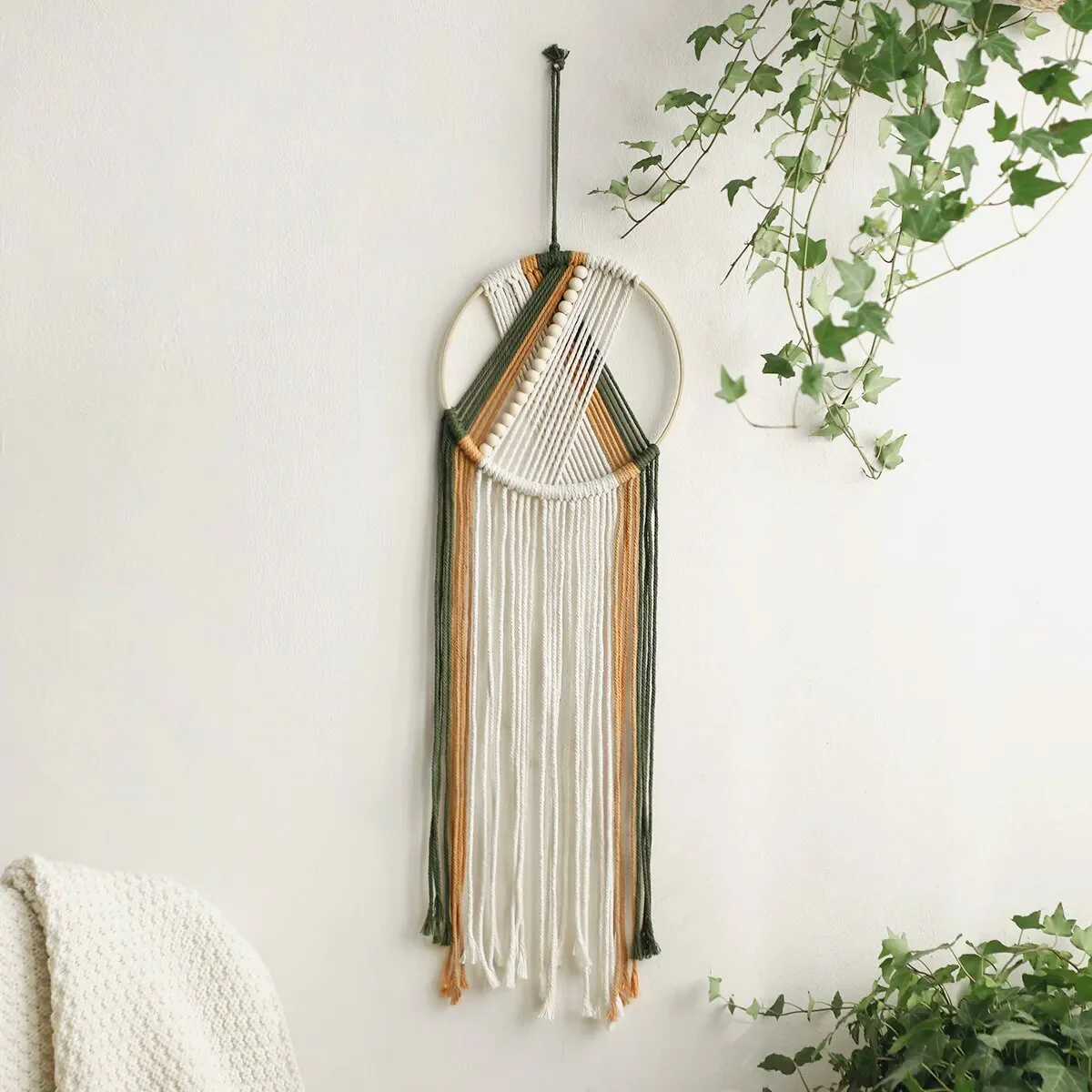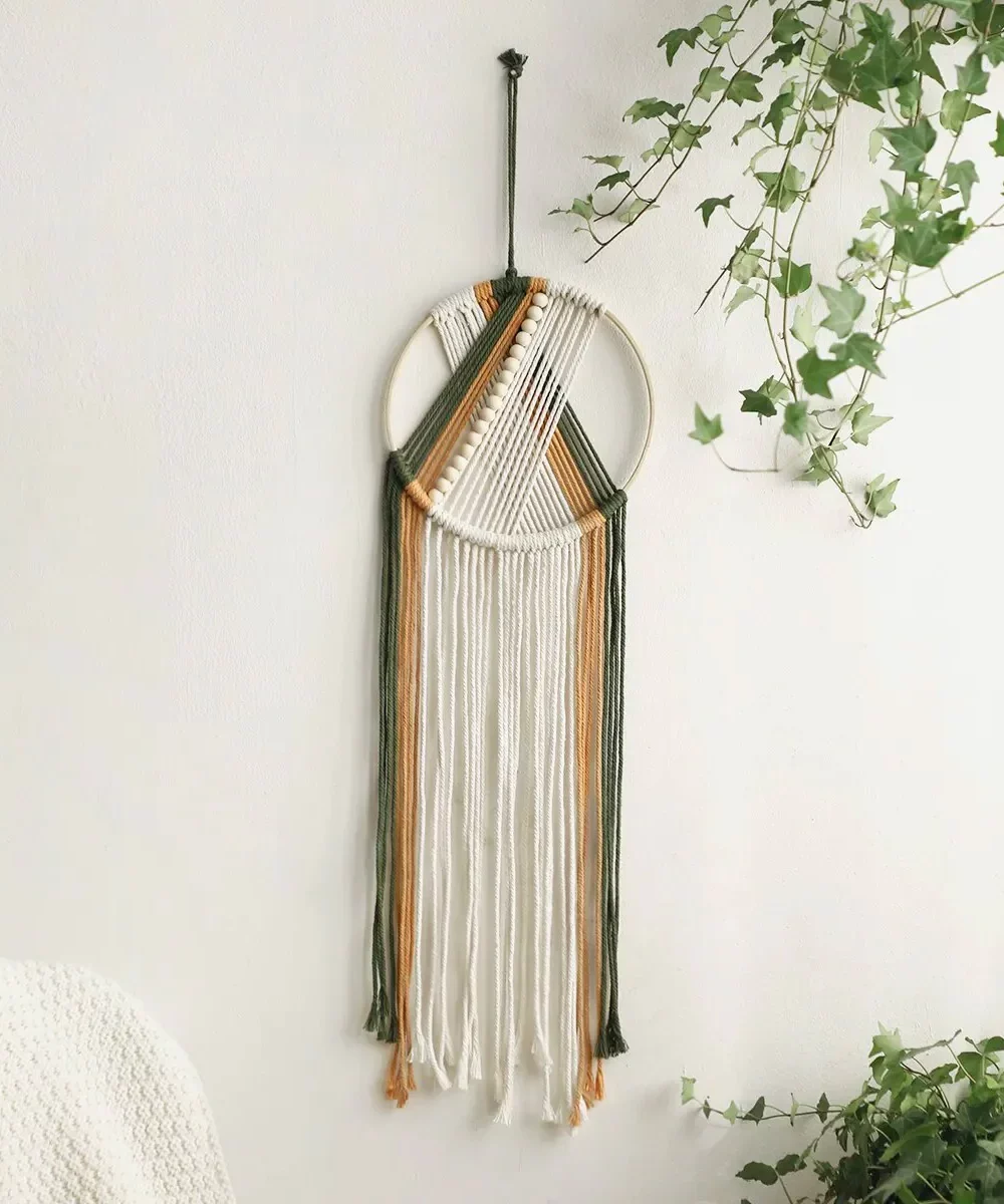 Ce magnifique attrape-rêve, situé à la frontière du style amérindien et du charme bohème, saura vous séduire par son élégance délicate et ses teintes beige, verte et jaune moutarde. Exprimez votre passion pour la décoration bohème avec cette superbe création qui marie symbolisme et esthétique, apportant de ce fait une jolie touche de pureté à la décoration de votre chambre à coucher.