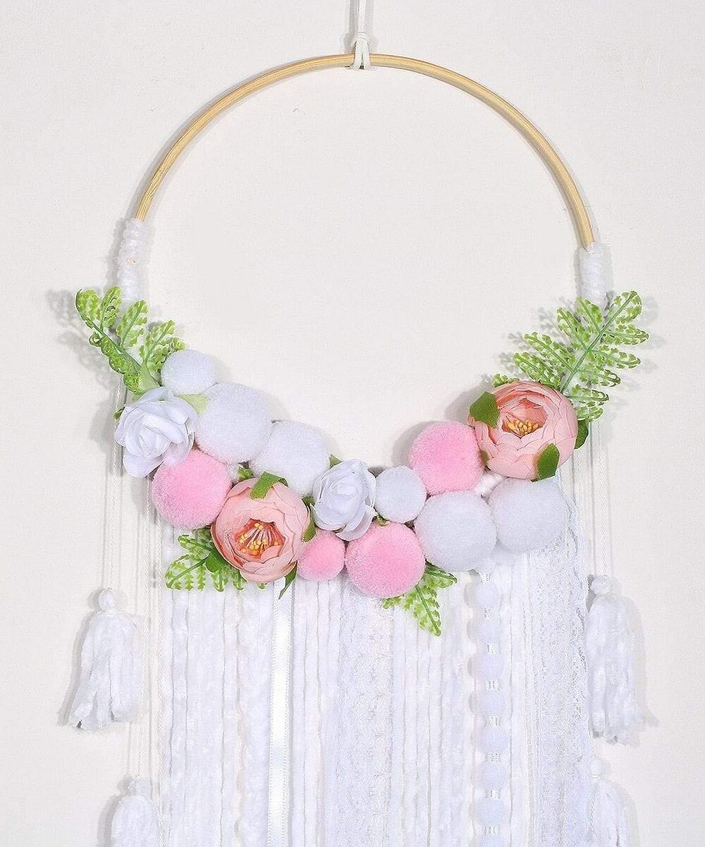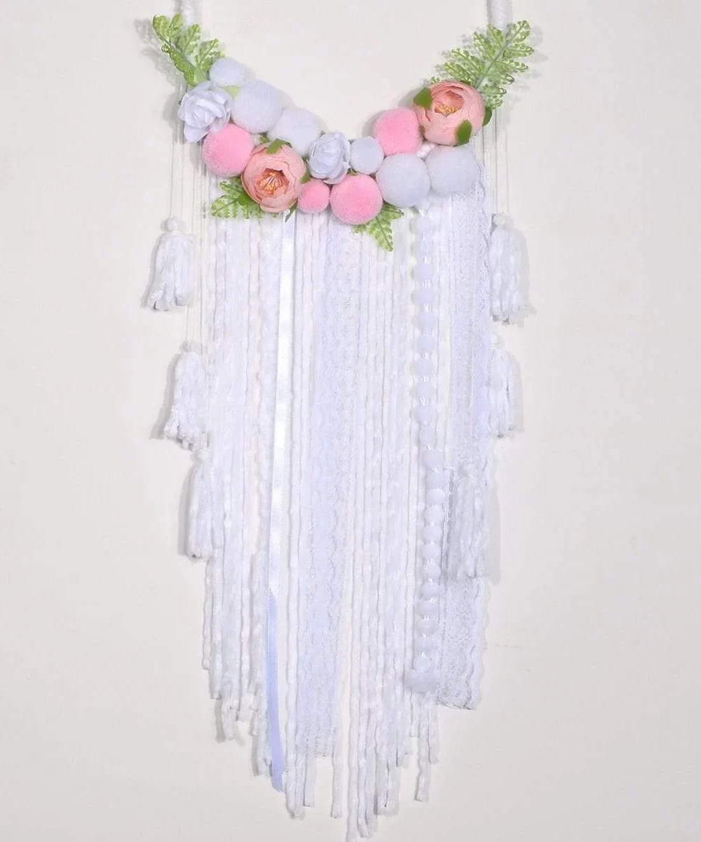 Éblouis tes invités par sa dentelle d’un blanc resplendissant, ses pompons blancs et roses viendront adoucir l’ensemble en ajoutant une note glamour et raffinée. L’ensemble suspendu par un anneau en bambou naturel viendra équilibrer le tout sous une note harmonieuse, naturelle et aux couleurs tendres !