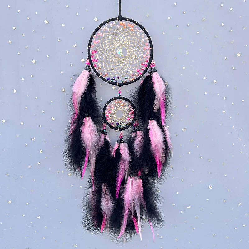 | Matériau | Anneau en métal, tissage en fil synthétique, perles en cristal et plumes synthétiques |