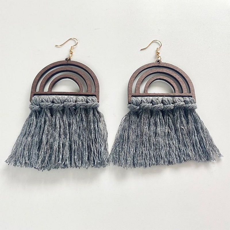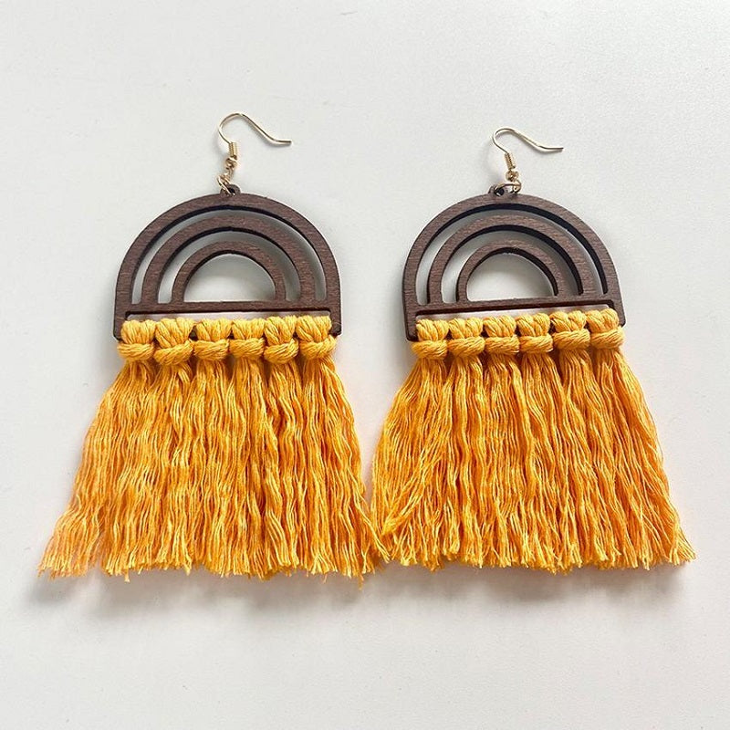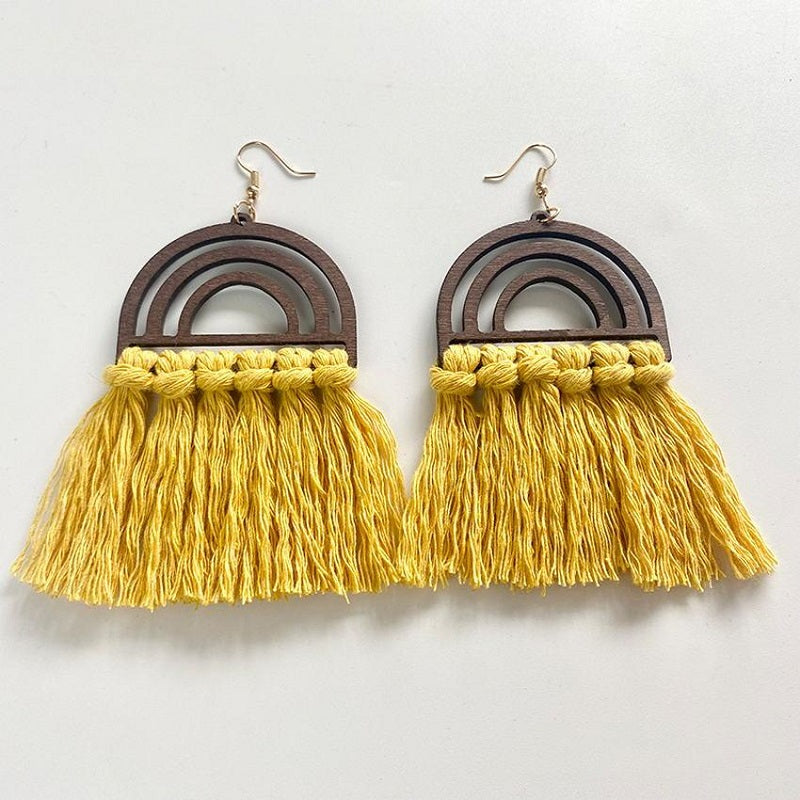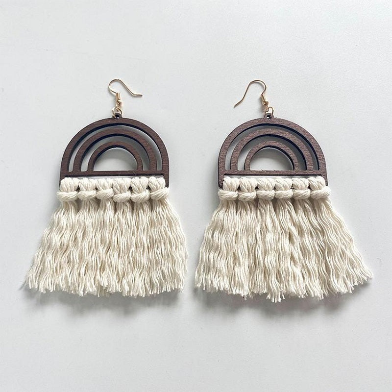 Une boucle d’oreille bohème avec une une arche en bois et un tressage en coton.
