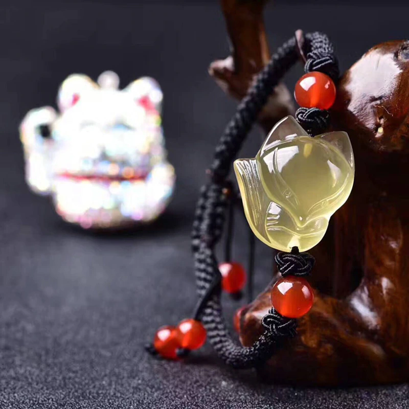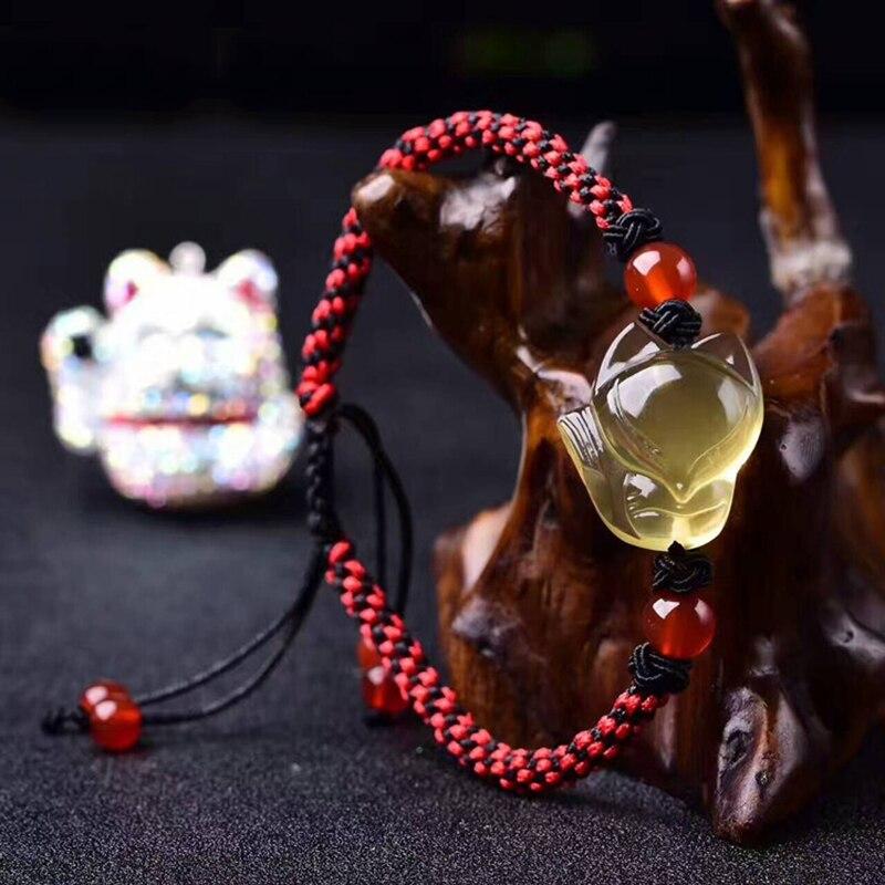 Ce bracelet en tissage tressage est fabriqué à la main à partir de matériaux de haute qualité. Le tissage en coton noir ou rouge est orné de belles perles de cristal rouge et d’un quartz jaune taillé en forme de renard. Le renard est associé à la malice et à l’au-delà dans de nombreuses cultures, tandis que le quartz jaune est une pierre puissante permettant d’éloigner les influences négatives, la nervosité, la fatigue, le stress, les angoisses et la maladie.