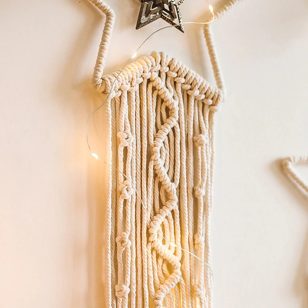 Pour une décoration bohème sublimée et une protection efficace, nous te conseillons d’accrocher l’étoile en Macramé près du lit, plus particulièrement là où il captera la lumière du soleil. Cette belle décoration murale se complétera parfaitement avec une source de lumière tamisée, comme une guirlande ou des bougies. Pour une touche douce et naturelle, tu peux ajouter une petite plante verte, tu verras : c’est magique !
