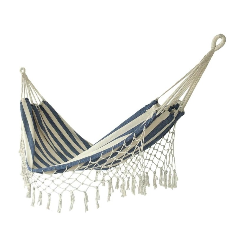 Ce hamac à rayures blanches et bleues est un ajout parfait à toute maison pour une ambiance méditerranéenne de qualité. Non seulement il apportera la couleur et la texture dont vous avez besoin, mais il vous fournira également un siège confortable pour les invités ! Que ce soit à l’intérieur ou à l’extérieur de votre jardin, assurez-vous qu’il y ait toujours un endroit supplémentaire où vos amis pourront se prélasser.