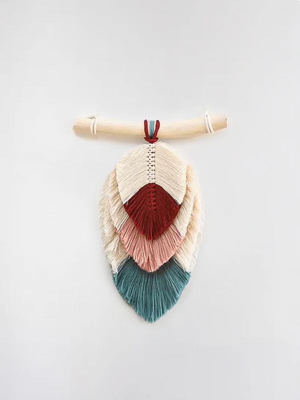 - Ajoutez une touche douce et naturelle à votre intérieur avec cette décoration murale en macramé, ornée de perles et colorée de teintes délicates, du beige et le pêche.