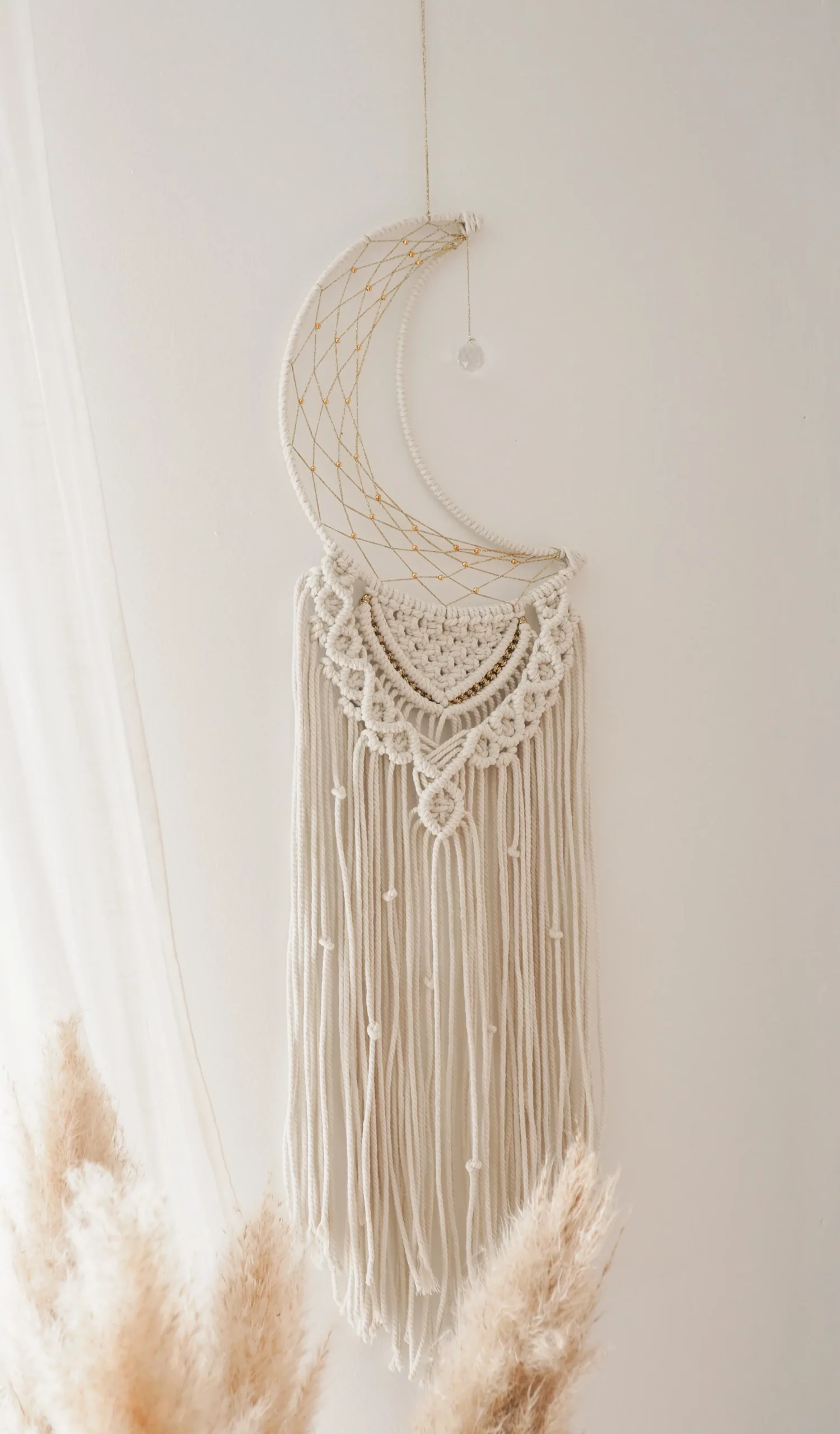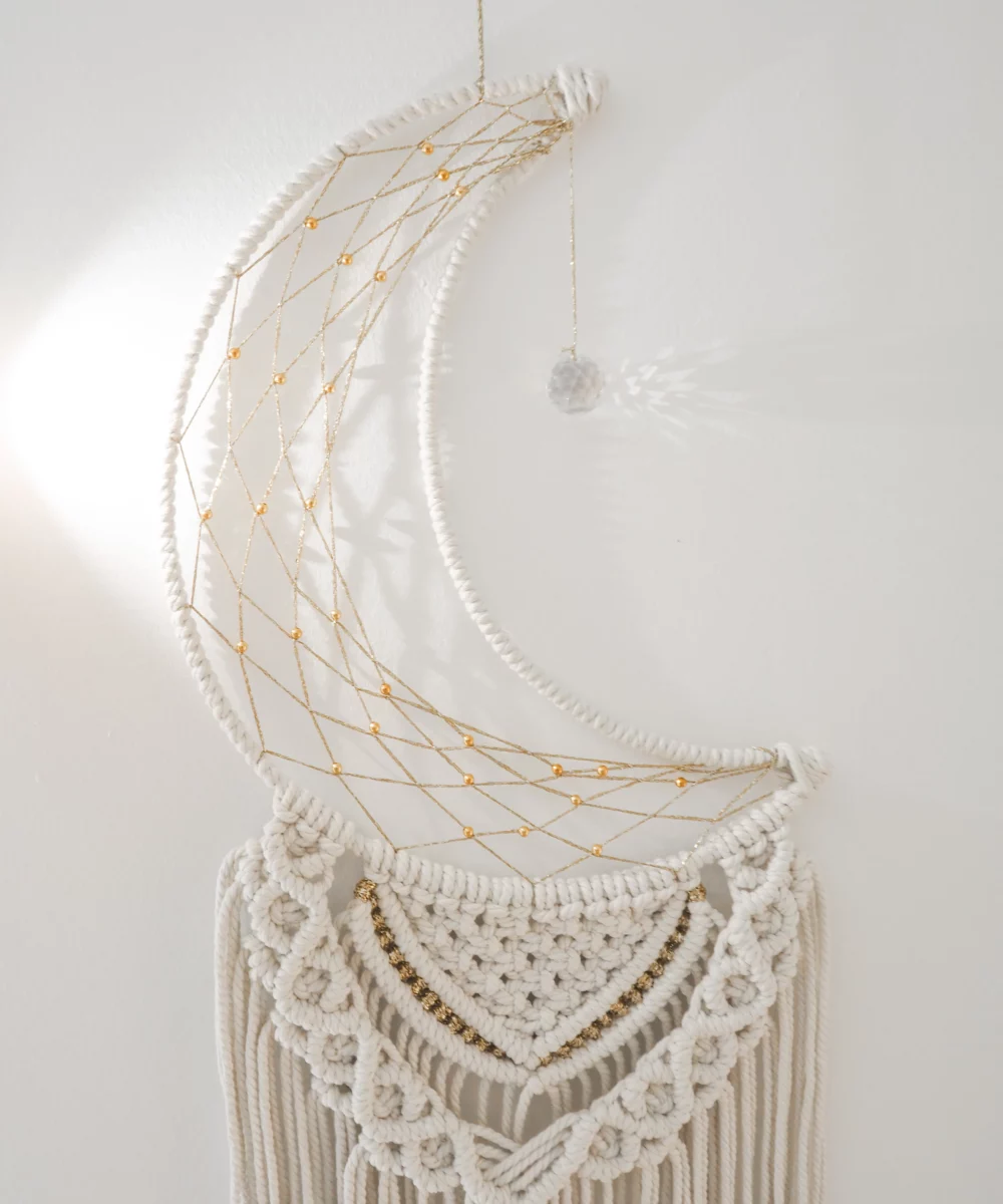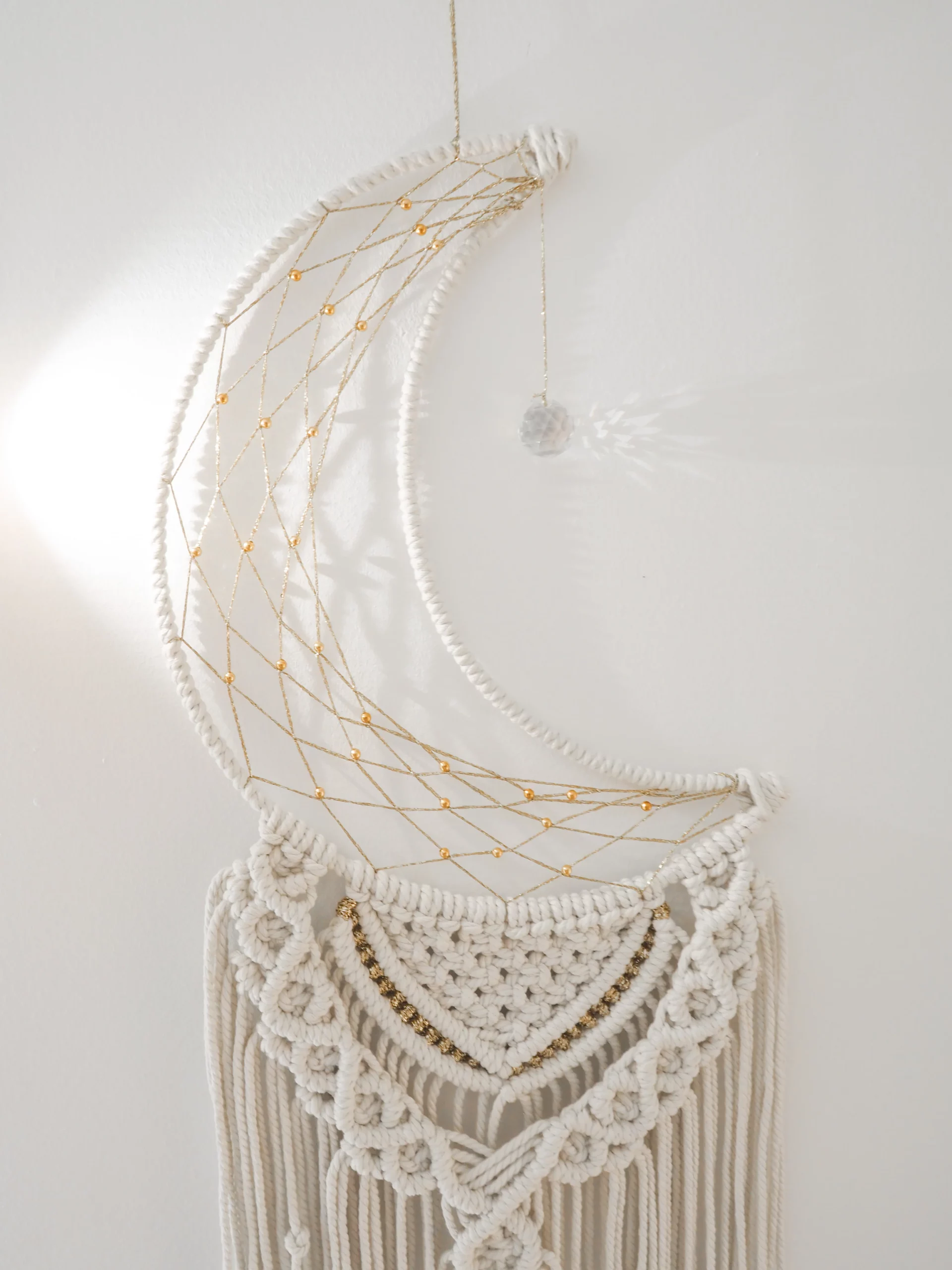 Macramé mural en forme de lune orné d’un suncatcher. Fait main.