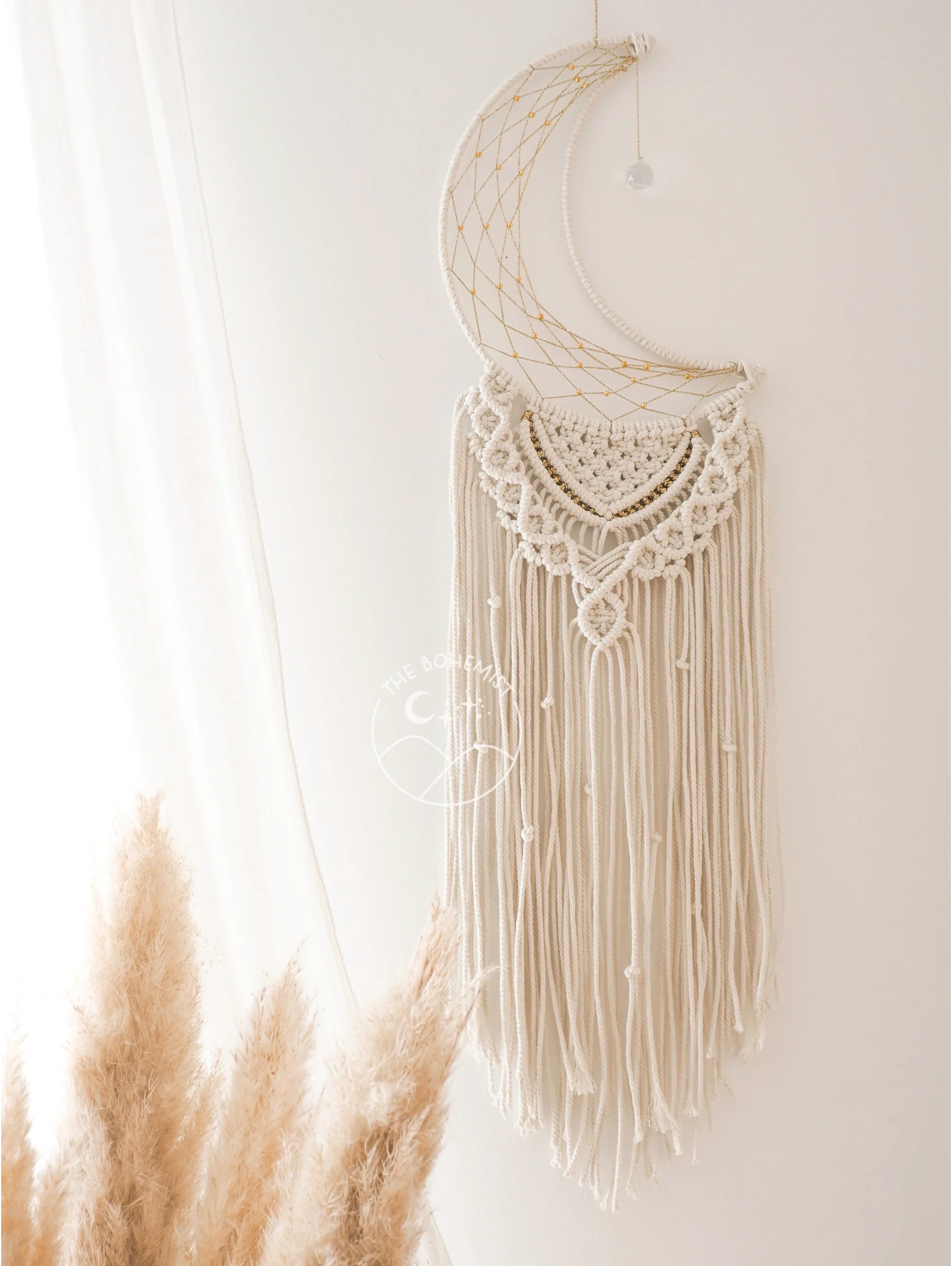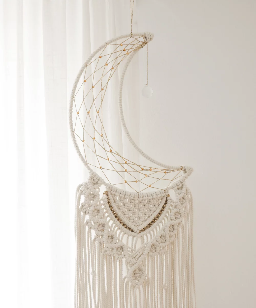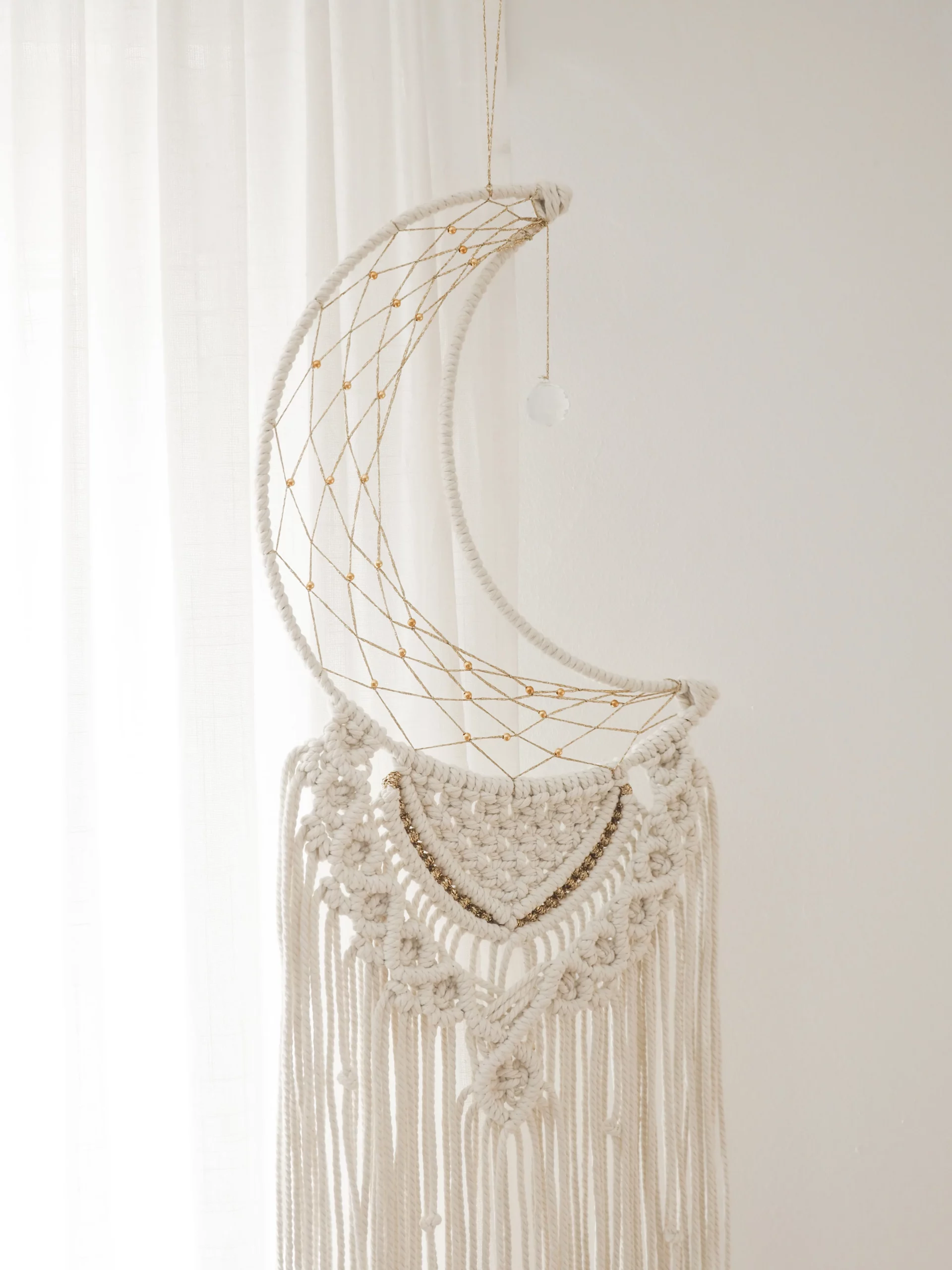 Macramé mural en forme de lune orné d’un suncatcher. Fait main.