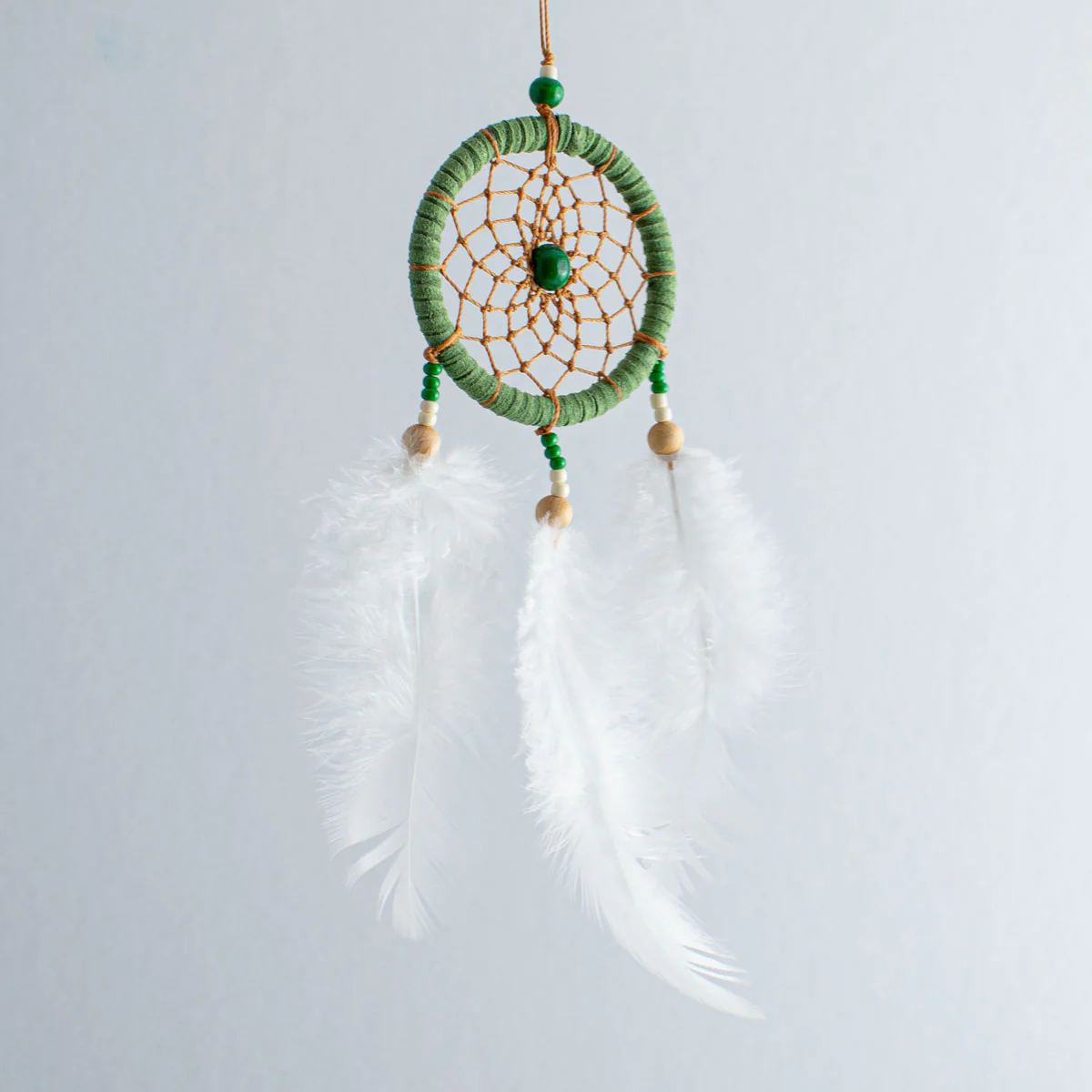 “Éveil de printemps” est un mini attrape-rêve aux notes florales et aériennes, qui célèbre l’épanouissement, le renouveau et la légèreté. Ses nuances de vert (irlandais, prairie, émeraude) et la douceur de ses plumes blanches invitent à la fois au repos et à la découverte.
