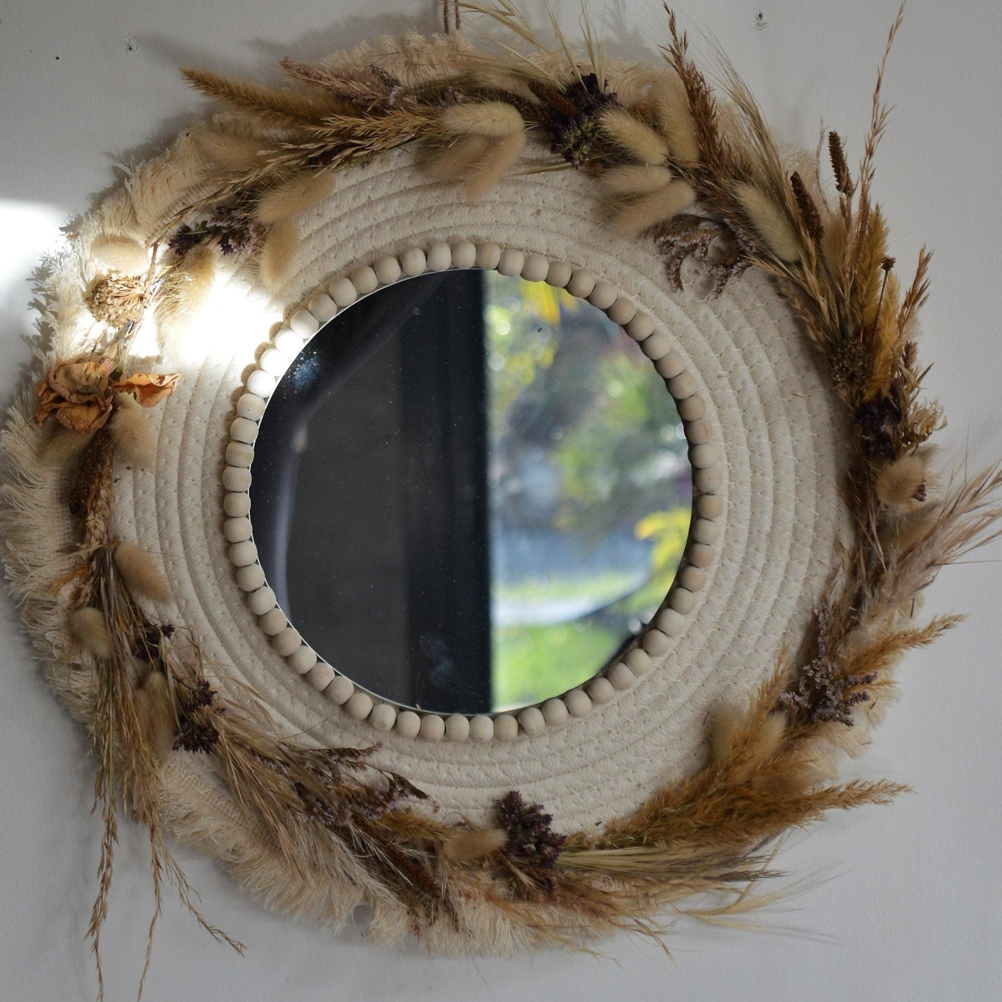 “Ajoutez une touche champêtre à votre décoration intérieure avec notre miroir de 43 cm à l’esprit champêtre. Il est orné de fleurs 100% naturelles, validées puis séchées et intégrées à la création pour un rendu authentique. Le socle en coton tressé écru et les perles bois brutes procurent une ambiance rustique et campagne à votre intérieur. Ce miroir est idéal pour une chambre à coucher, un salon , il complète parfaitement votre décoration champêtre. Inspiré de la nature par Swanell.