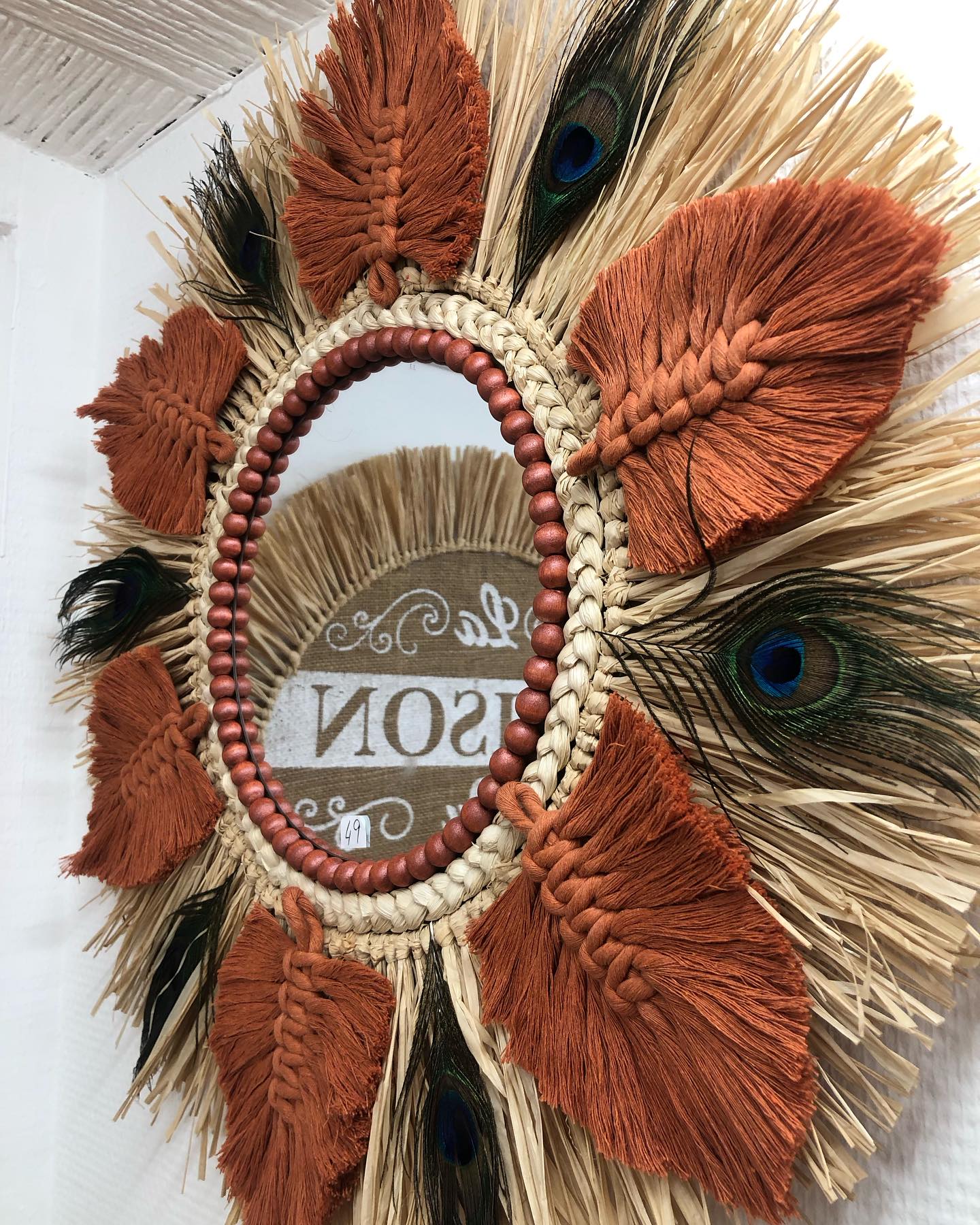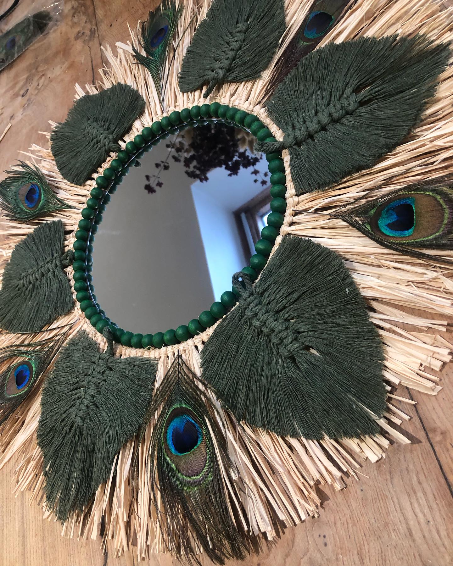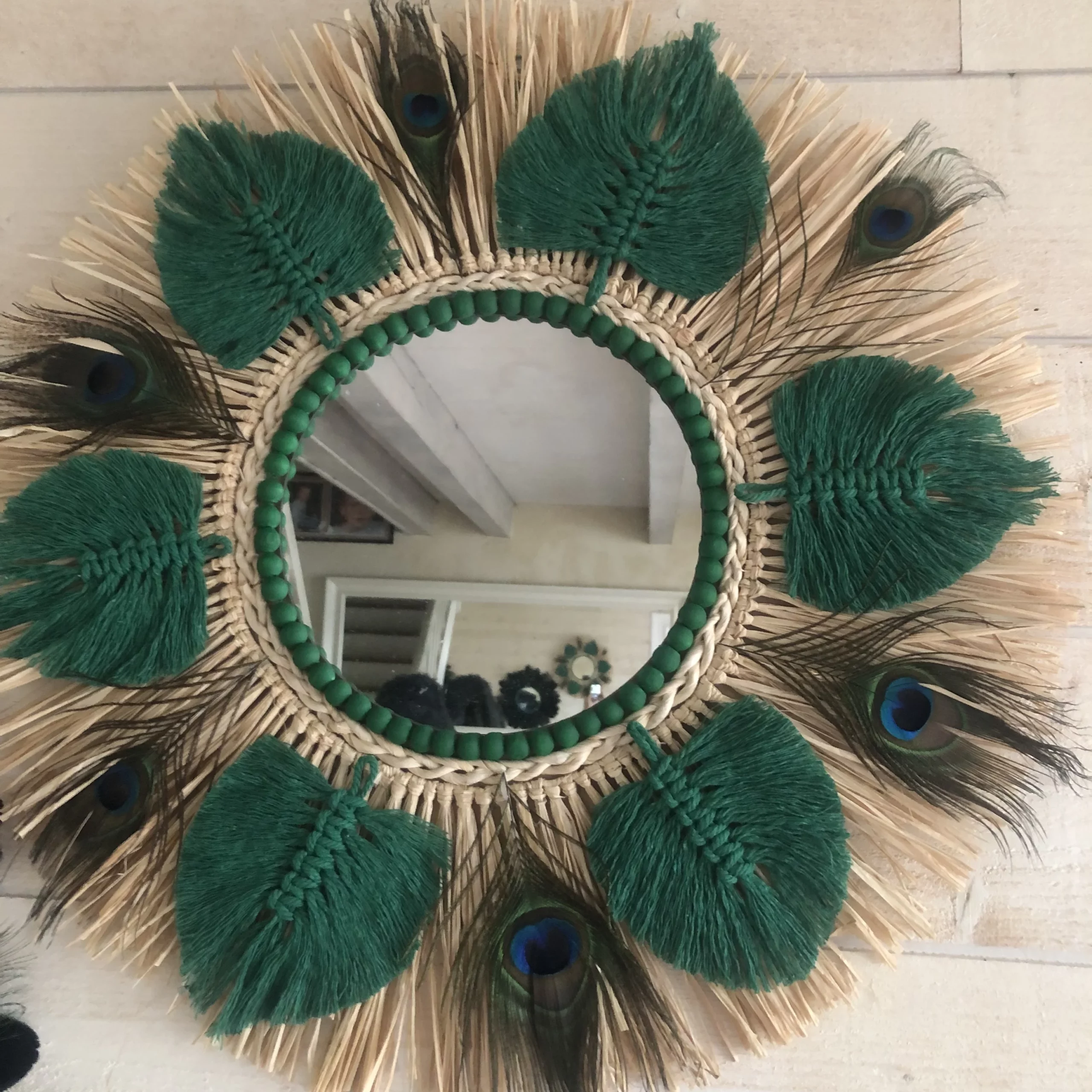 Grande nouveauté SWANELL pour ce miroir très original avec un support bois, une glace de 20 cm (taille au choix ), de la corde de maïs tressée, du raphia naturel, des feuilles en coton macramé de tous les coloris possibles sur commande, et des plumes de paon entre chaque feuille en coton. Modèle très original, unique, fabriqué et imaginé par Angèle, créatrice charentaise !