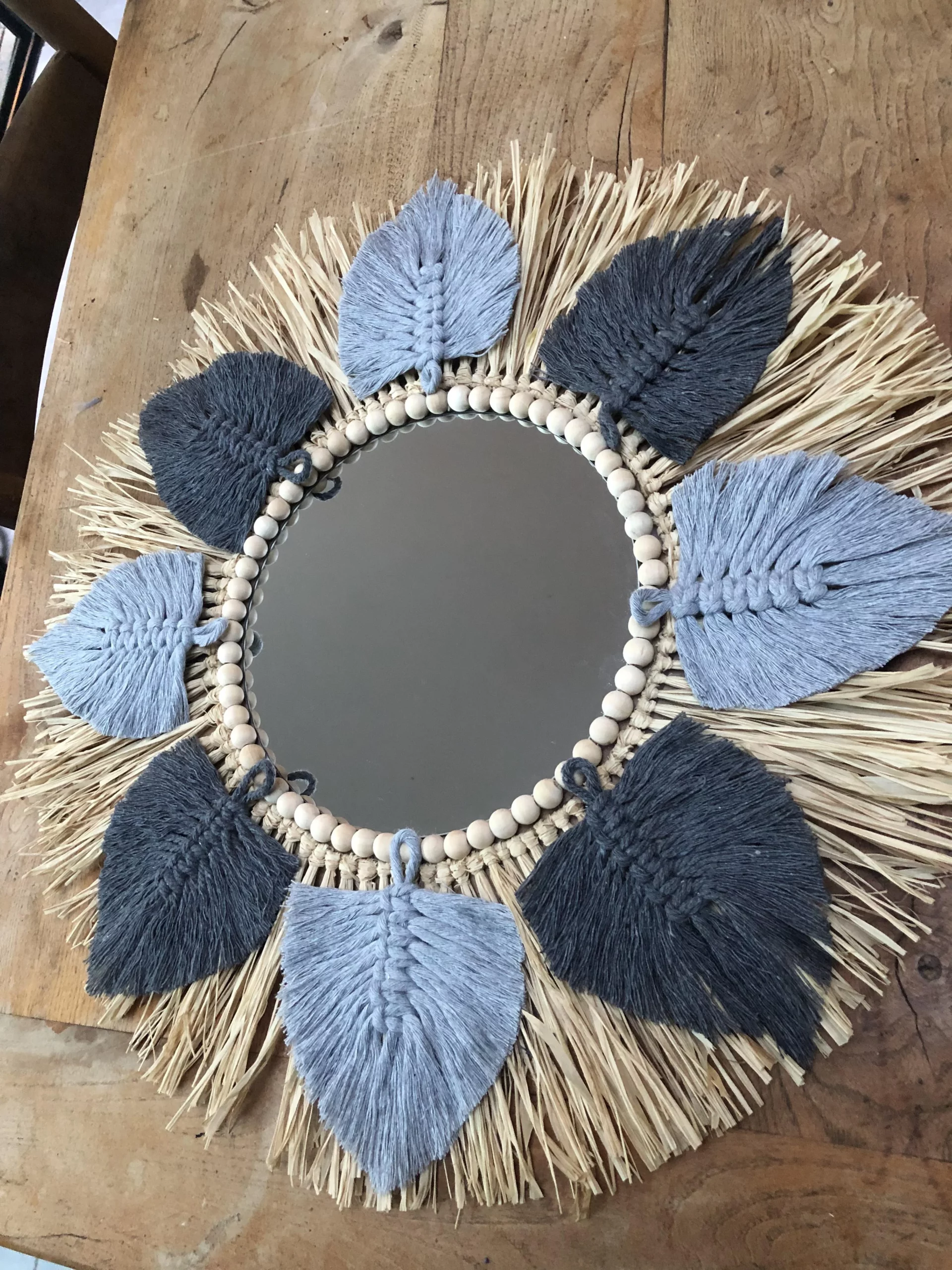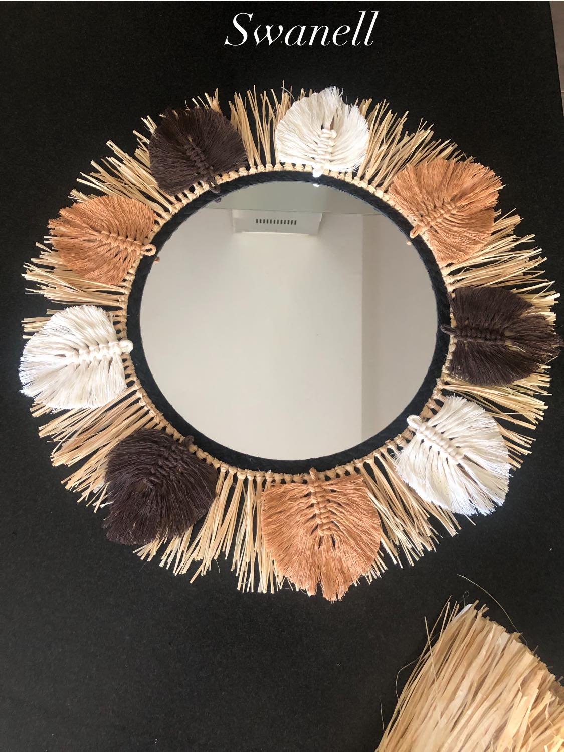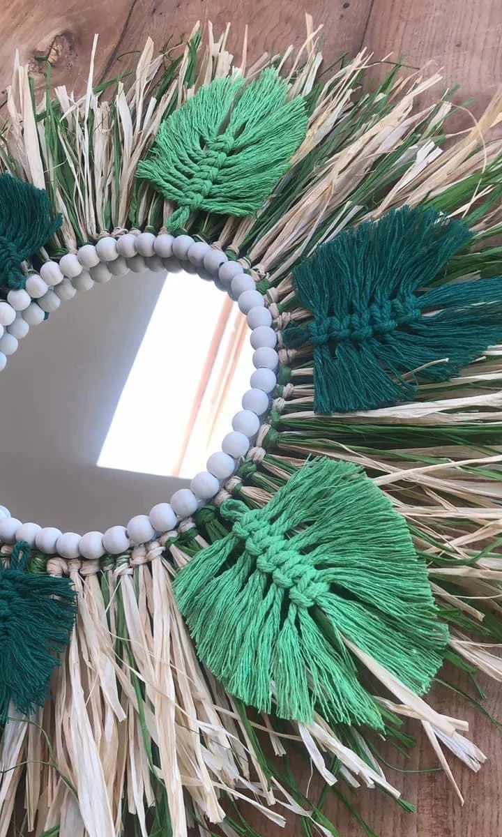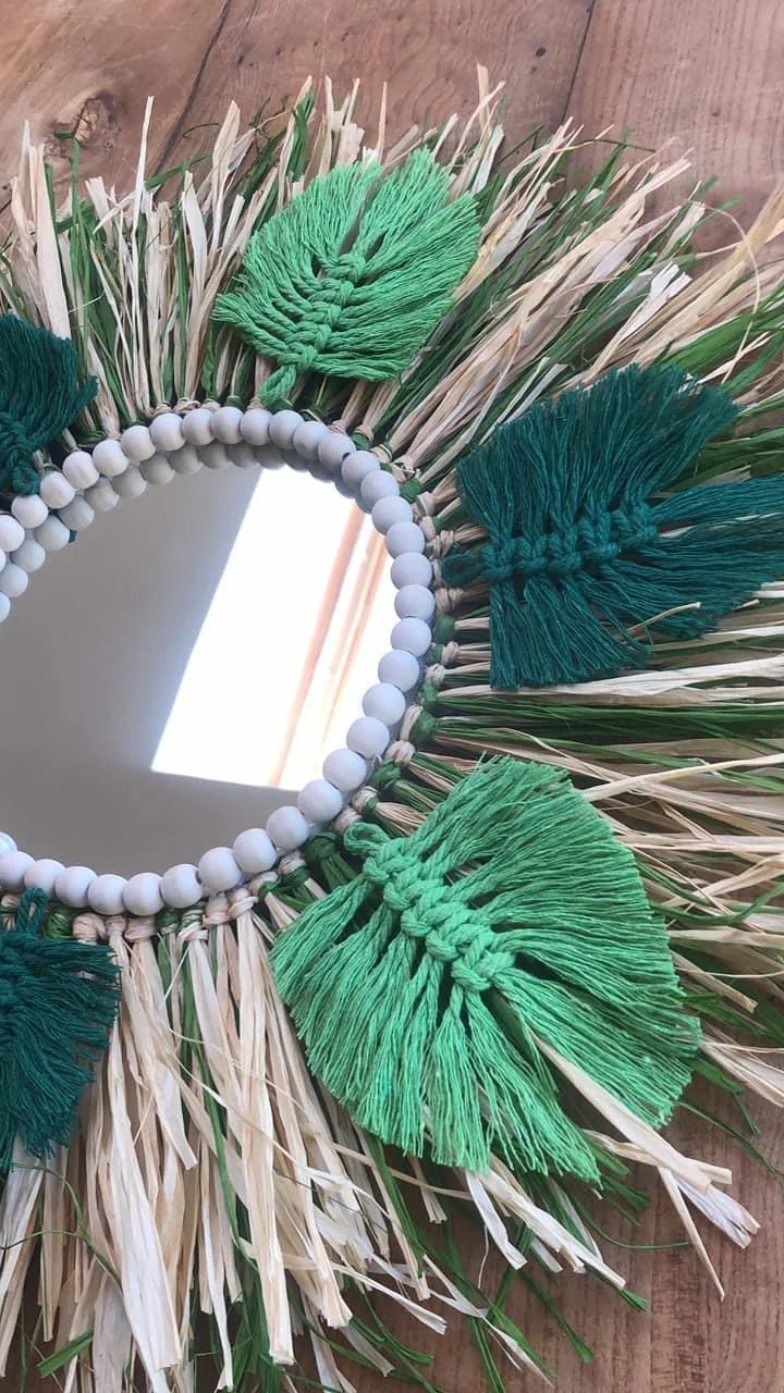 Miroir en raphia naturel et feuilles en coton macramé (différents coloris au choix)