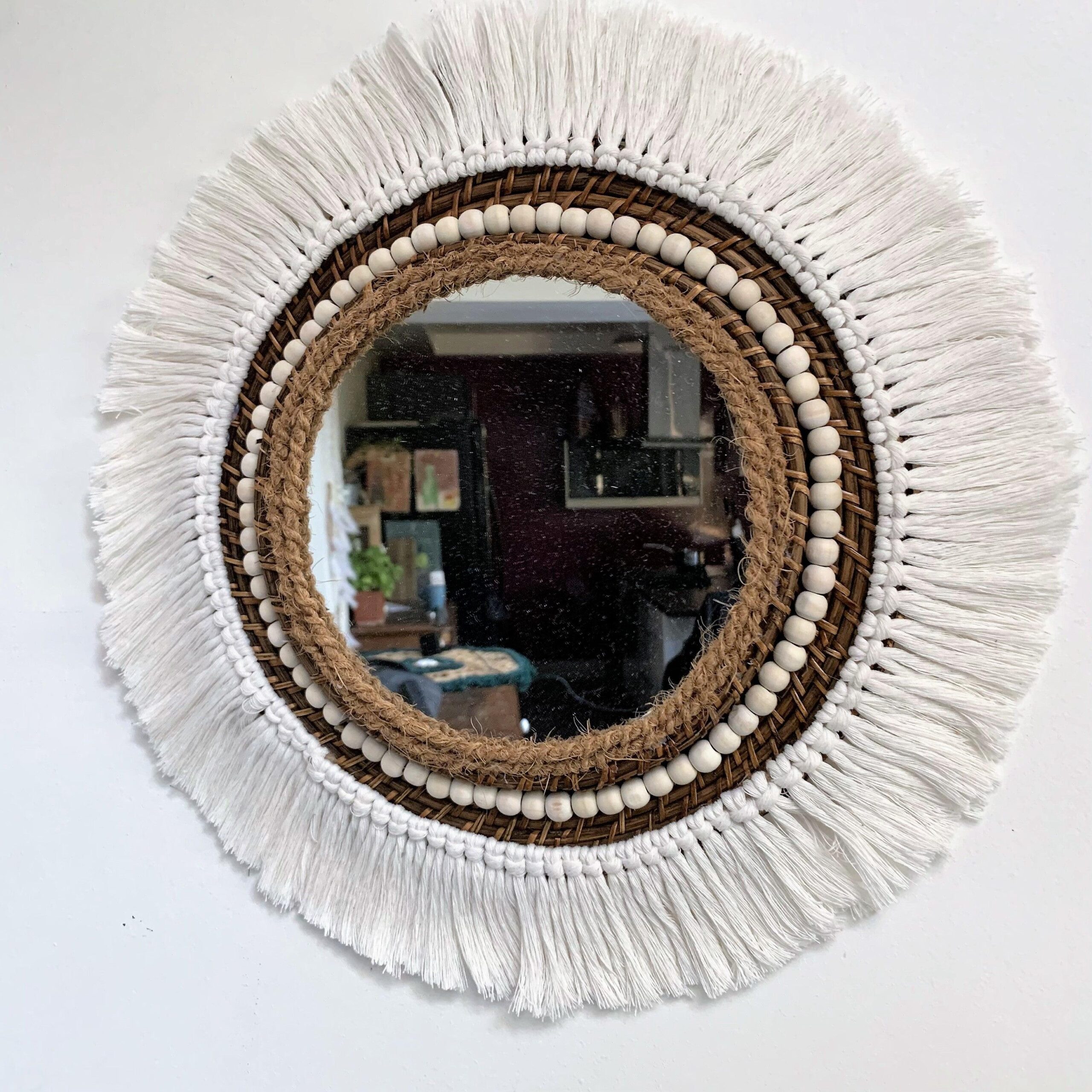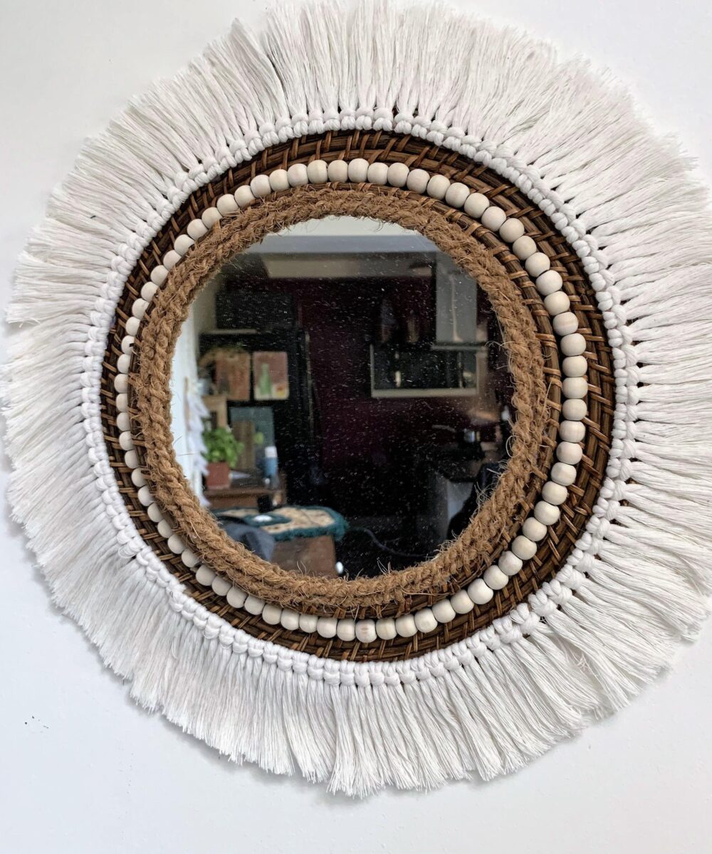 Ce miroir en rotin et coton avec des perles en bois écrues est juste parfait pour apporter une touche tendance BOHEME CHIC à votre décoration. Sa créatrice, Angèle la charentaise, y a mis toute sa douceur et son originalité pour créer une harmonie parfaite.