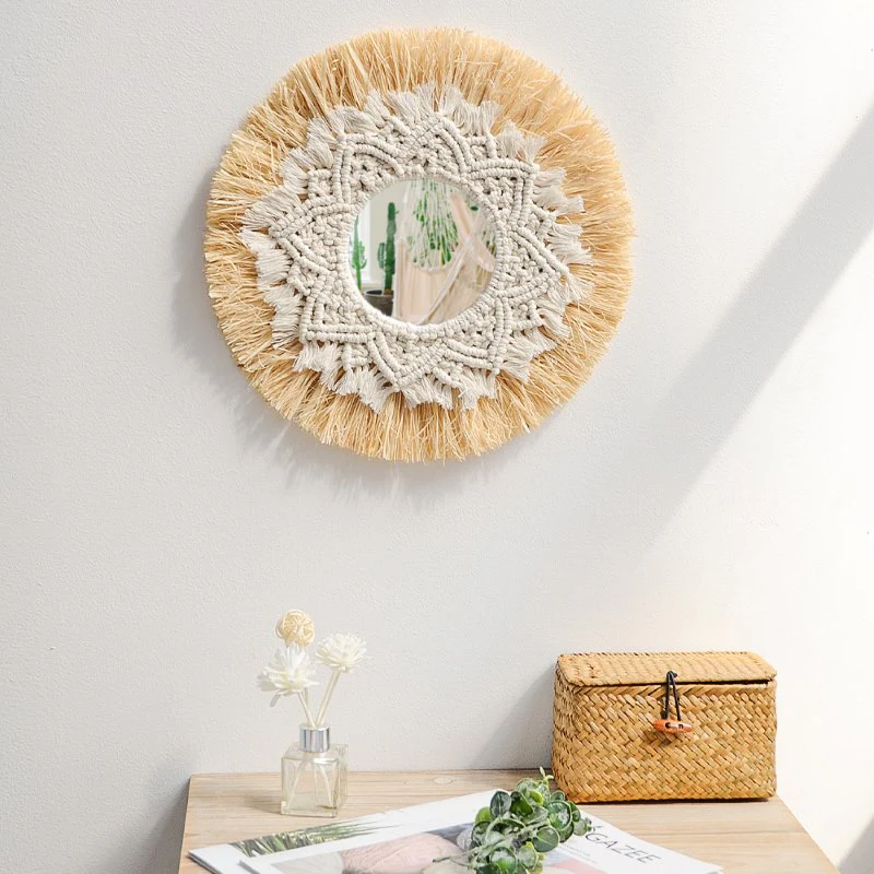 Ce miroir en raphia se sentait seul, alors on a tissé une jolie couronne de macramé pour lui tenir compagnie. Et maintenant, c’est à lui de vous bichonner.