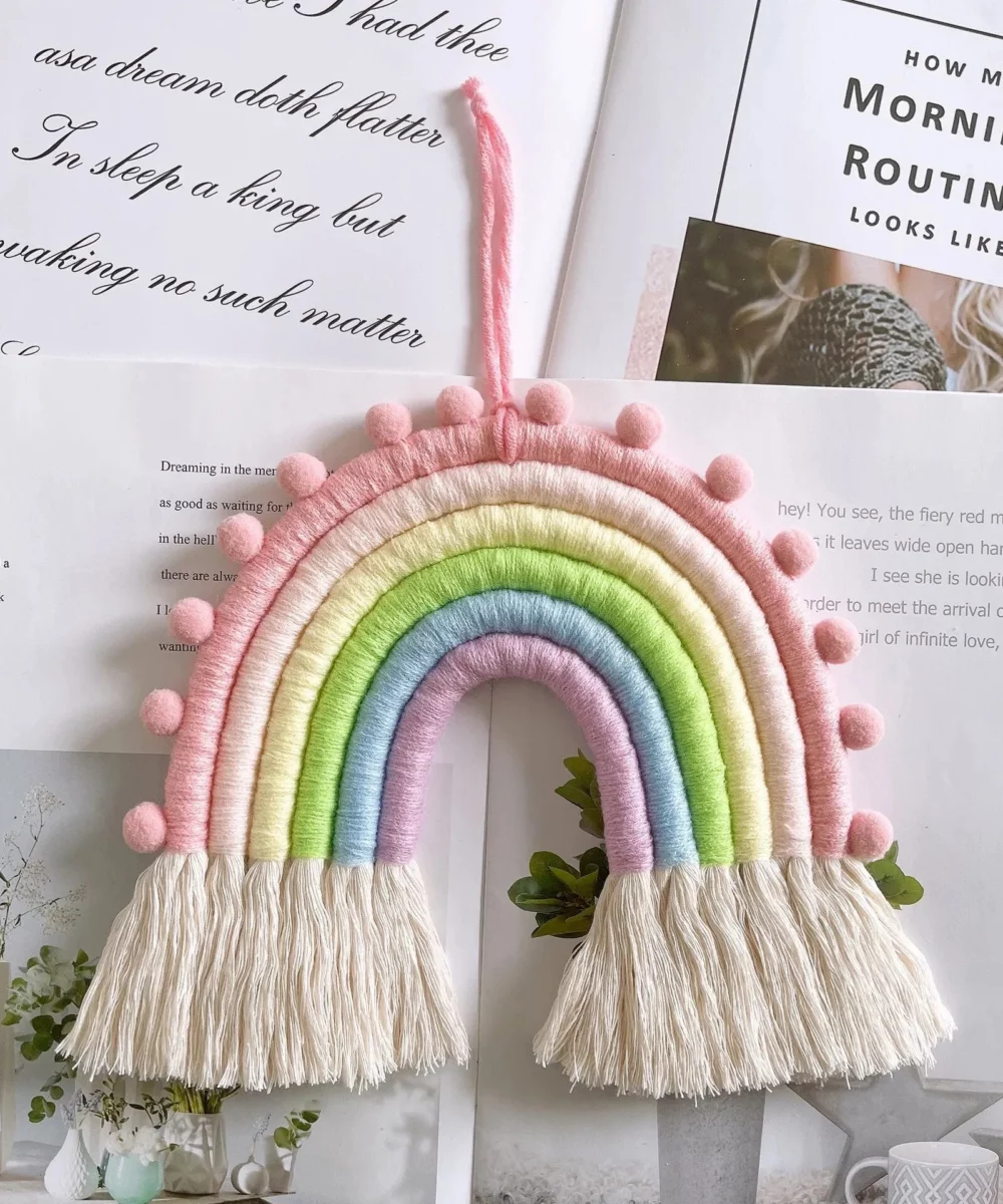 Vous serez directement séduit par son magnifique dégradé de couleurs aux tons pastels ou vifs, à votre convenance, ainsi que par ses adorables petits pompons en macramé qui lui confèrent toute son originalité. L’arc-en-ciel symbolise l’espoir et le renouveau après la pluie, faisant de lui un symbole puissant à garder près de soi. Offrez à votre enfant le bonheur d’un décor à la fois harmonieux et réconfortant.