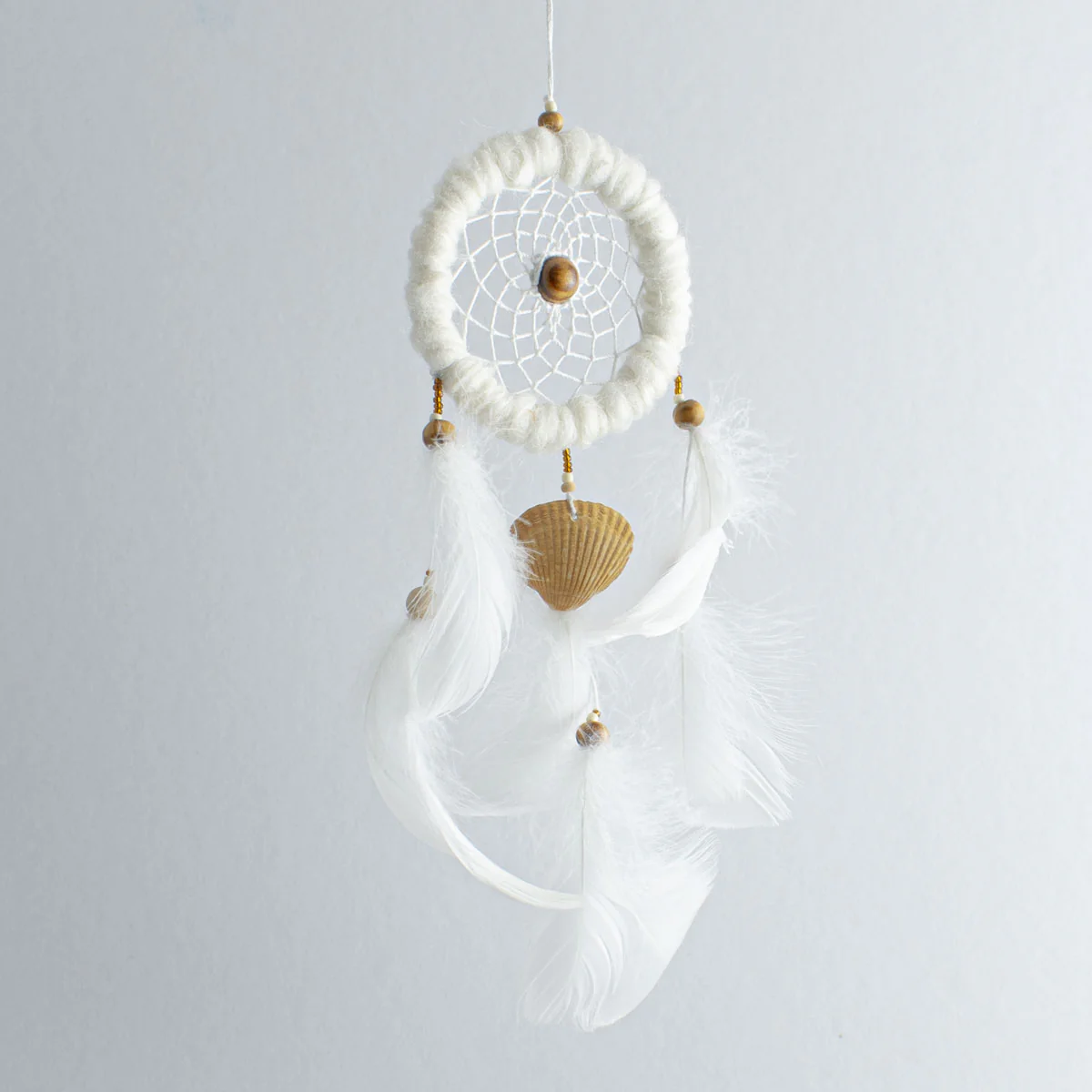 “Mer lumineuse” est un attrape-rêve de petite taille, blanc et écume, entièrement fabriqué à la main. Par ses teintes nébuleuses et éthérées, il évoque l’écume de mer et les crêtes mousseuses survenant au sommet des vagues.