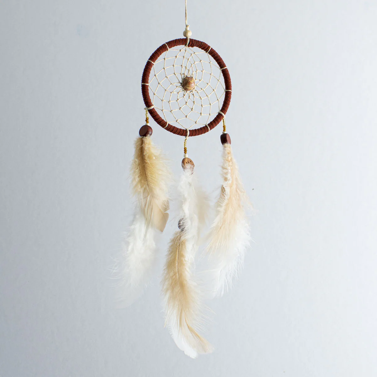 “Rosée du matin” est un attrape-rêve de petite taille, doux et épuré. Ses teintes chaudes et ses nuances de grenat évoquent la rencontre des premiers rayons du soleil avec la rosée du matin qui perle sur la toile.
