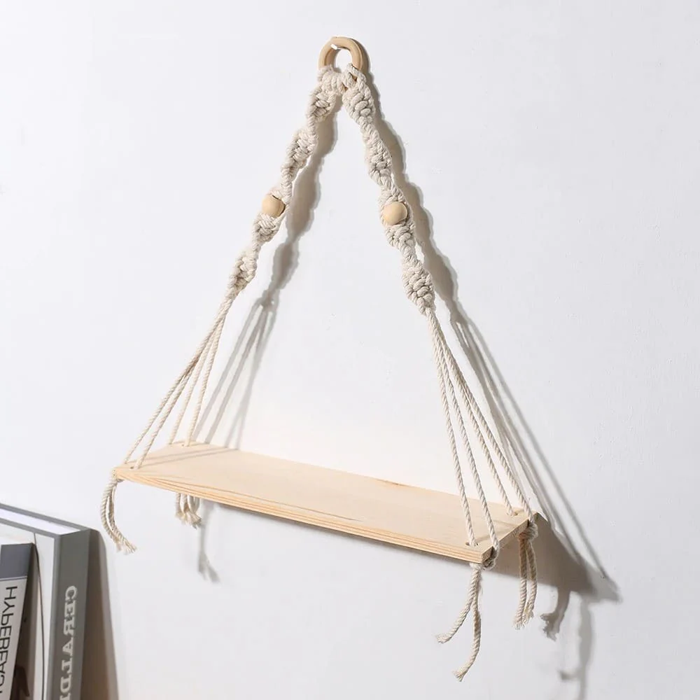 Une petite étagère suspendue en macramé.