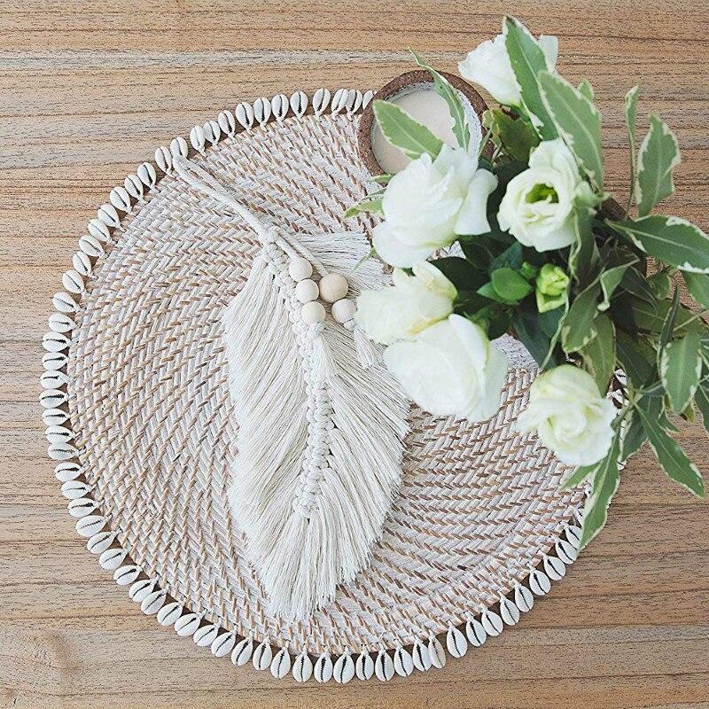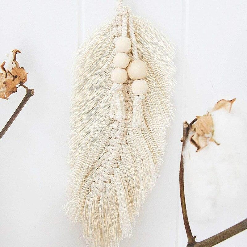 Trois plumes faites main en coton pour une suspension de feuilles en tressage splendide. Faites avec un mélange de nœuds complexes nos plumes sont finement réalisées pour apporter à votre décoration un style bohème inimitable. Avec sa taille moyenne et son style sobre mais chic, notre suspension est idéale pour compléter une décoration déjà présente ou pour commencer doucement une déo boho.