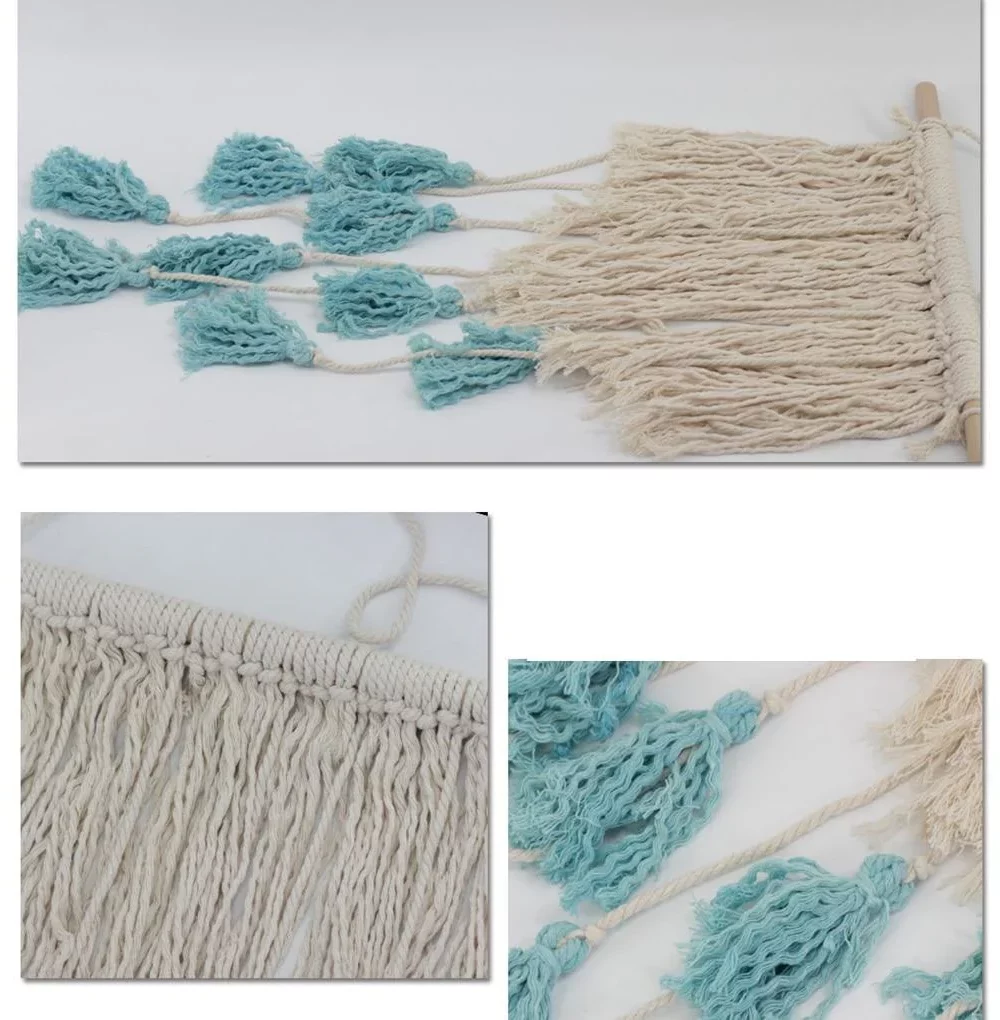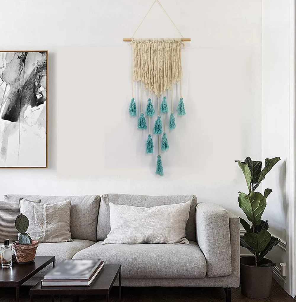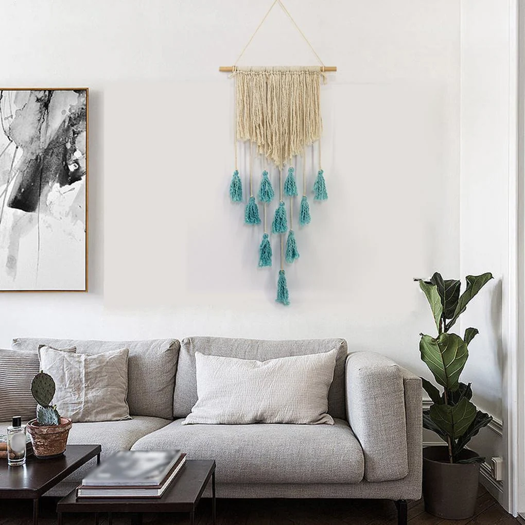 Avec sa cascade de pompons bleus, cette tenture en macramé ressemble à un petit nuage de pluie. Cette décoration murale apporte de la fraîcheur à votre intérieur, une touche de légèreté et une pointe de couleur.