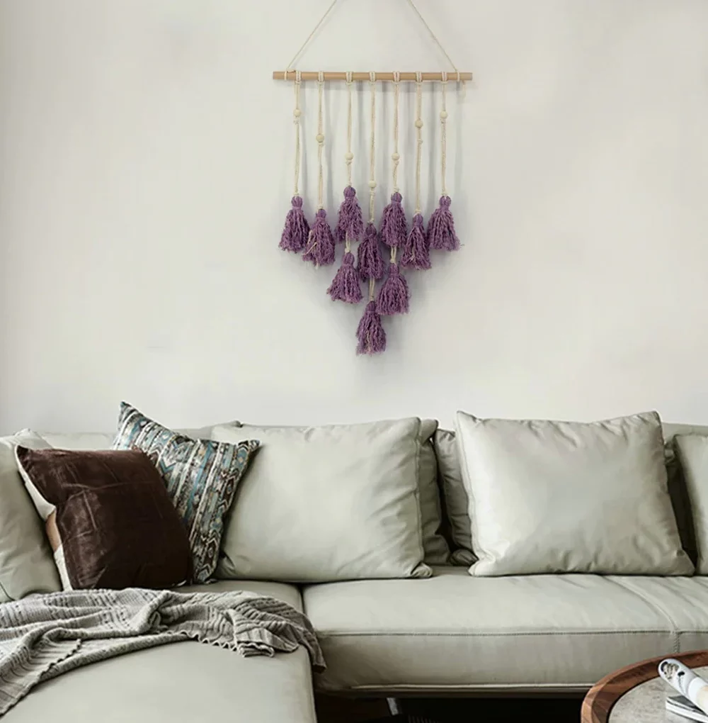Une tenture macramé et ses pompons violets