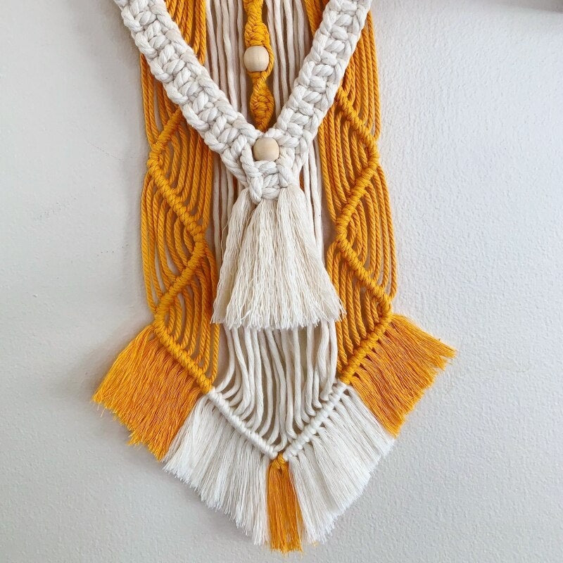 Ce tressage mural est un chef-d’œuvre. La couleur naturelle du coton et du tressage orange crée un look élégant et subtil que l’on ne retrouve dans aucune autre œuvre d’art, ce qui rend cette décoration unique pour votre salon !