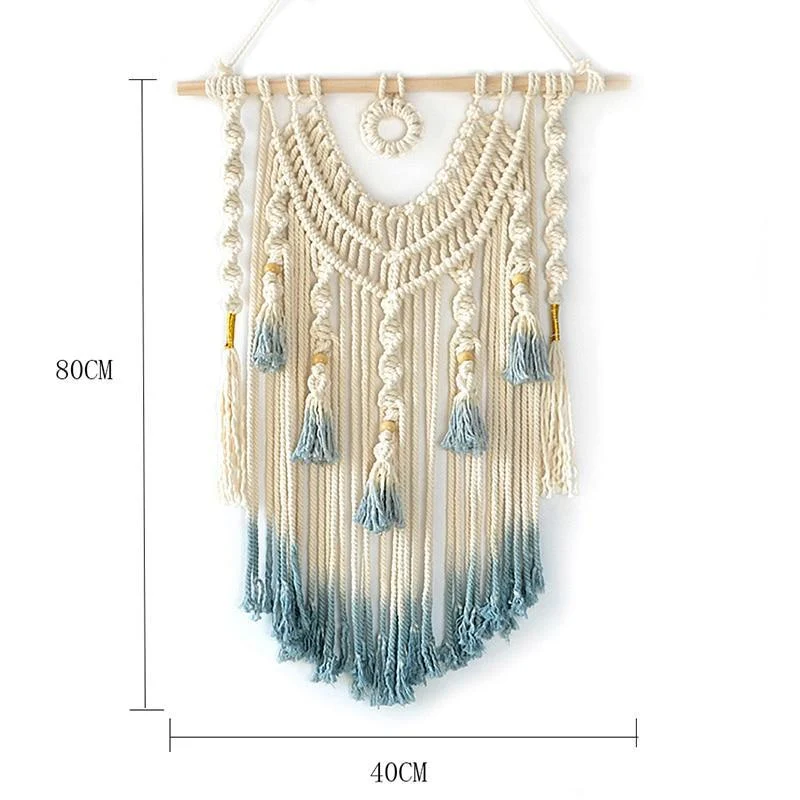 Accrochez cette tenture en macramé au mur de votre chambre ou salon et vous pourrez ressentir tout l’esprit bohème qui s’en dégage. La tenture murale en macramé Lili c’est une subtil association entre le coton, le bois et le métal grâce à une technique de tissage ancestrale et artisanale. Les extrémités des pompons sont teintées d’un bleu clair couleur ciel pour apporter un peu plus de fraîcheur à l’ensemble.