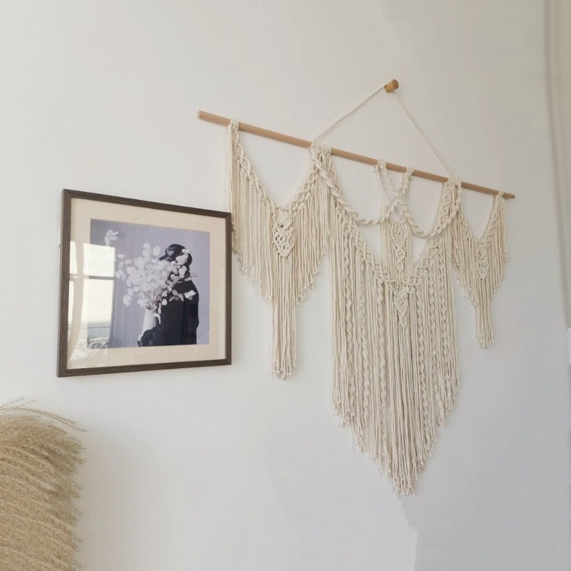 Découvrez notre tête de lit tressage en coton beige naturel. Cette pièce d’art bohème reflète notre savoir-faire en matière de tressages muraux et de grandes tentures. Réalisée à la main cette tenture murale en tressage illuminera votre décoration d’une ambiance bohème unique de par sa grande taille et son maillage unique. N’hésitez pas à l’adopter dans votre chambre à coucher et à la mixer avec d’autres tissages pour un rendu des plus agréables.