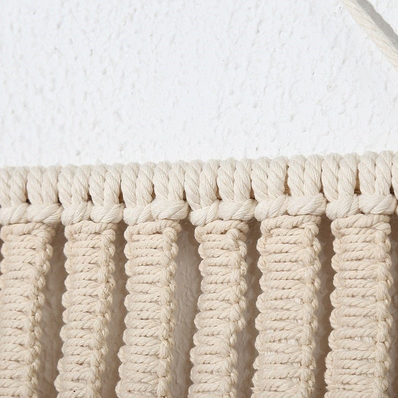 Un tressage mural artisanal fait main en coton naturel teinté.
