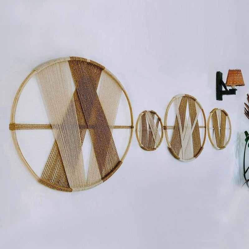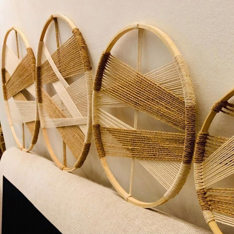 Un tressage mural style moderne en cercle de bois naturel et coton fait-main.