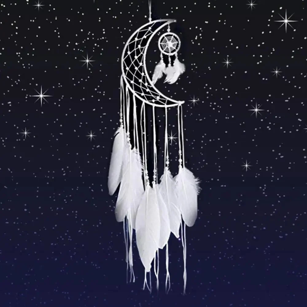 Attrape-rêves indien en forme de croissant avec pierres précieuses brutes et plumes
