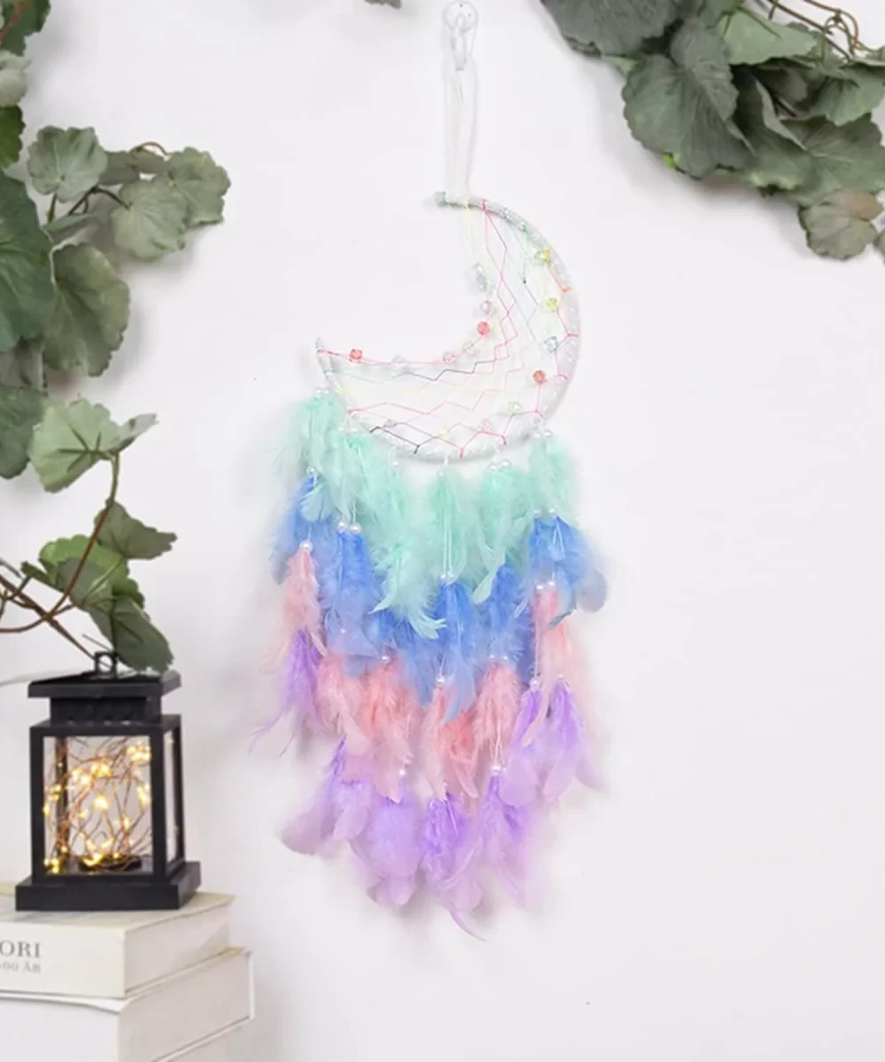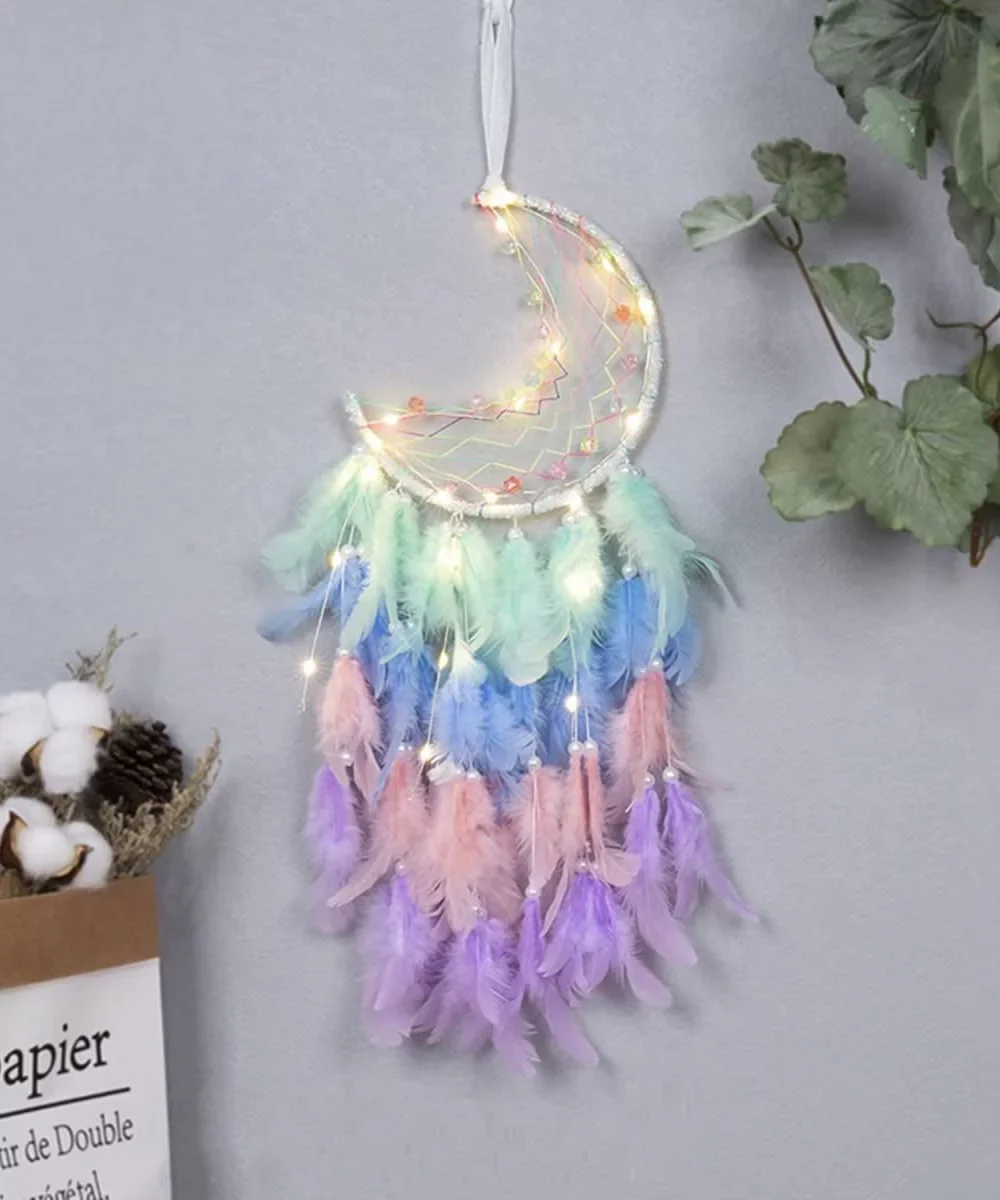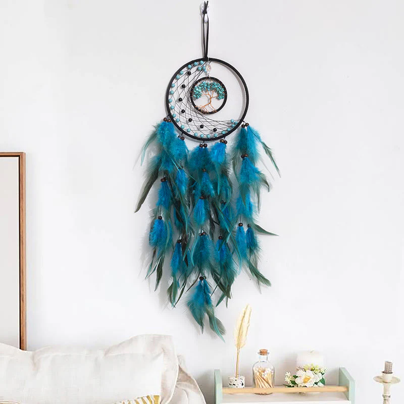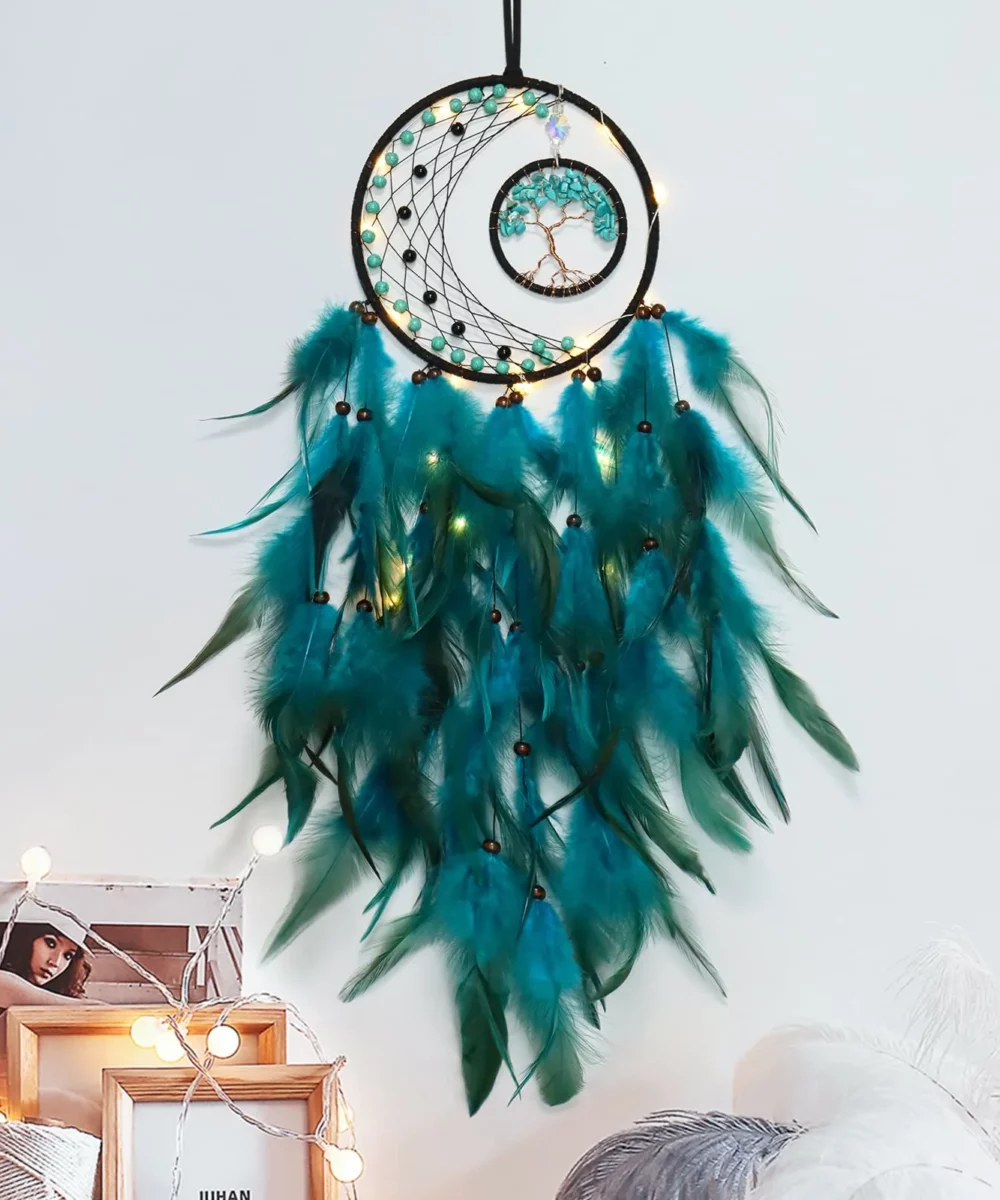 Attrape-rêves à plumes en forme d’arbre de vie turquoise à LED Olivenorma
