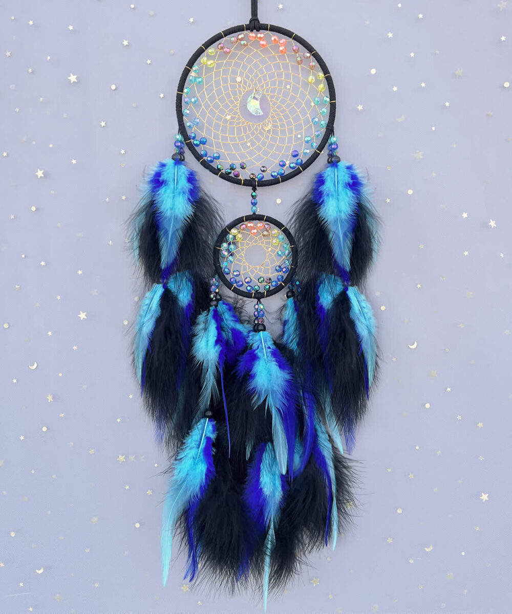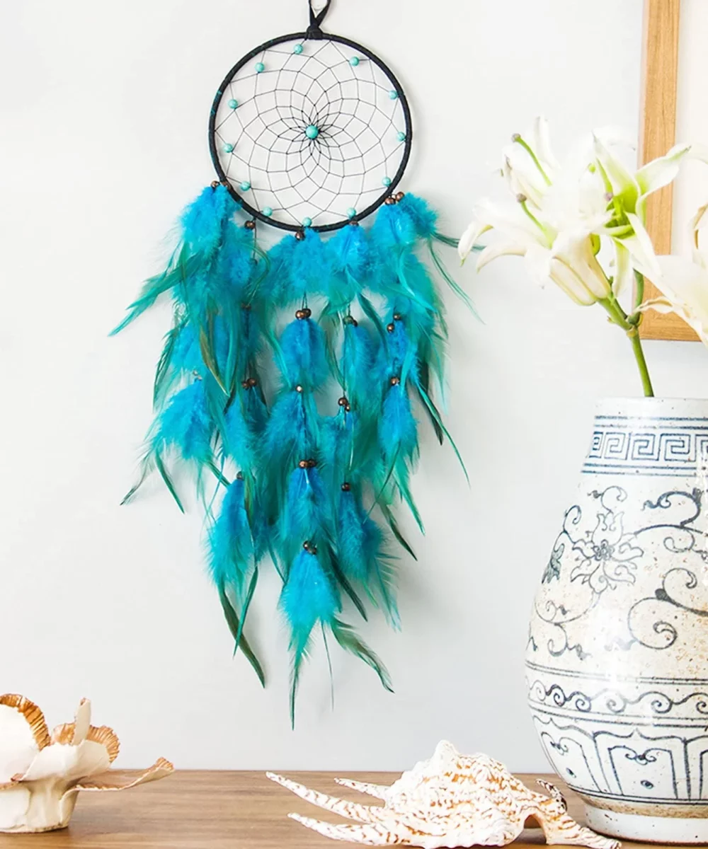 Attrape-rêves à plumes bleues et florales tressées en perles turquoise Olivenorma