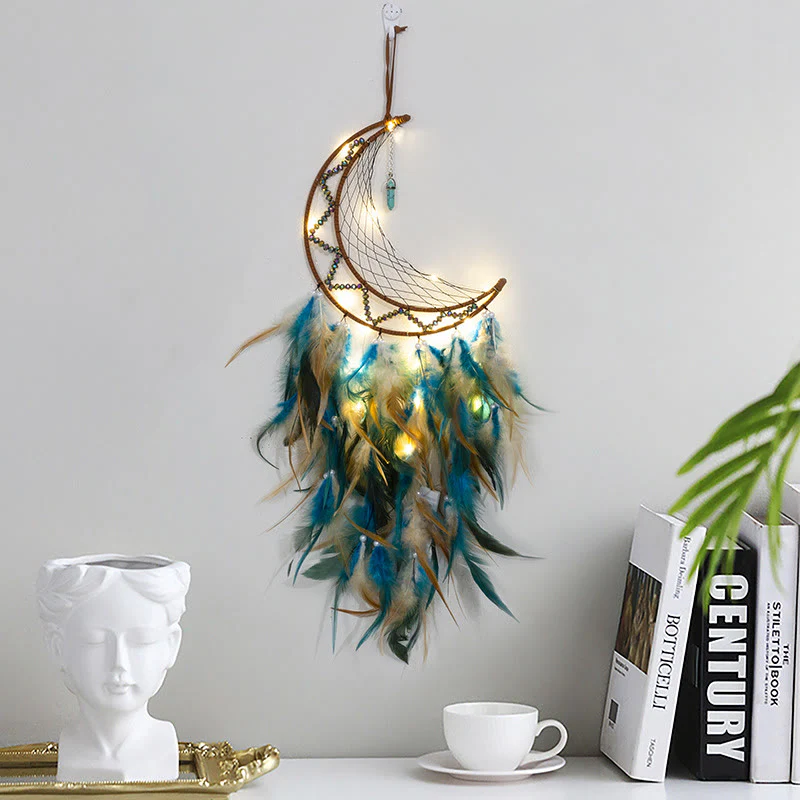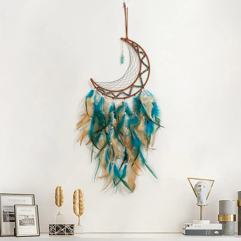 Pendentif turquoise Olivenorma en perles d’hématite et plumes de lune attrape-rêves