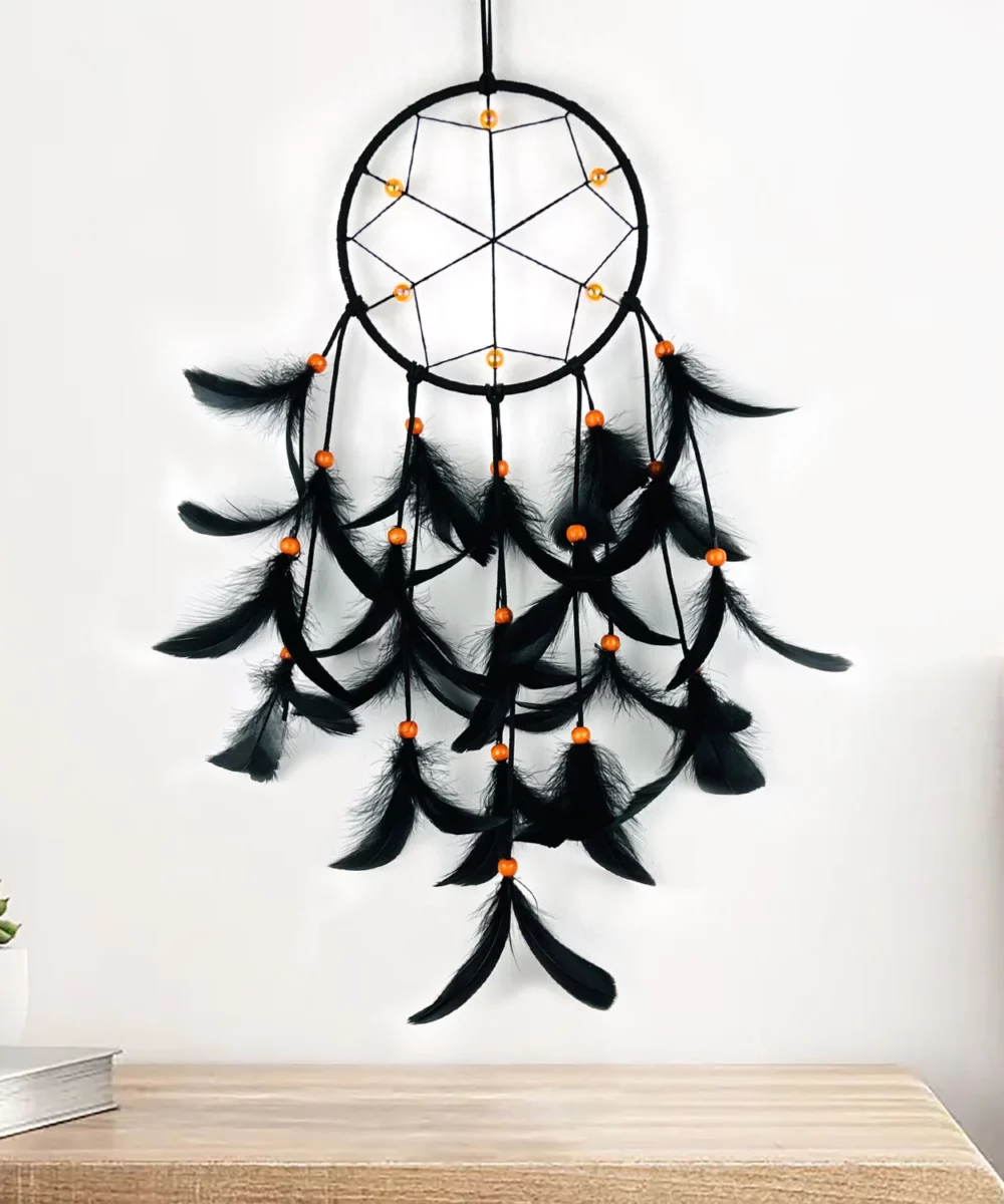 Attrape-rêves d’Halloween Olivenorma en plumes noires et perles orange