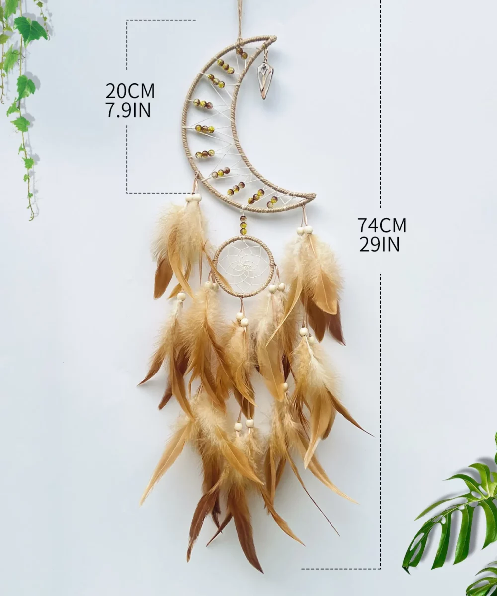 Attrape-rêves indien en forme de croissant avec pierres précieuses brutes et plumes