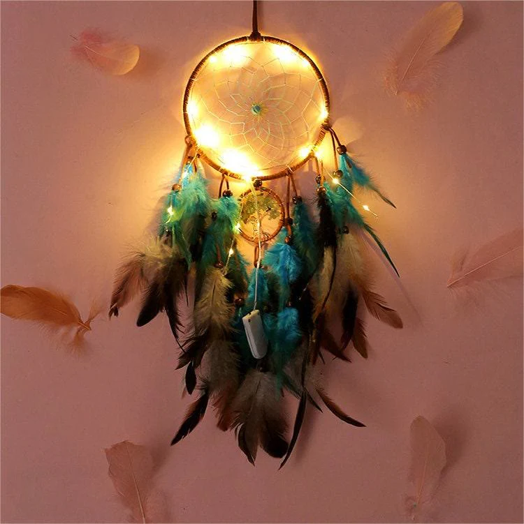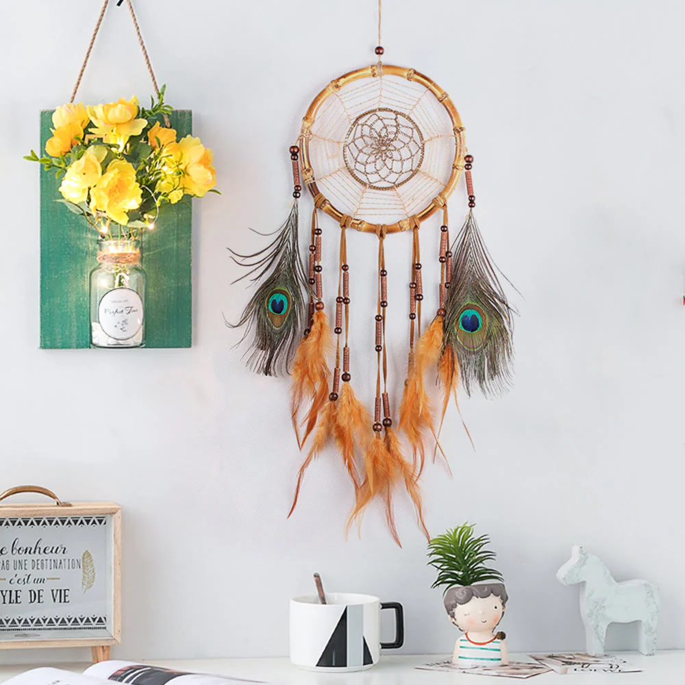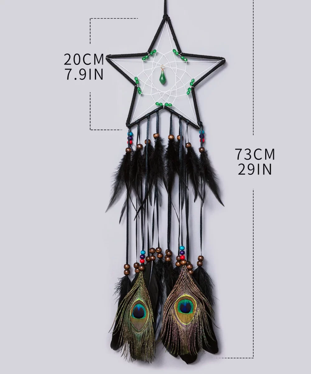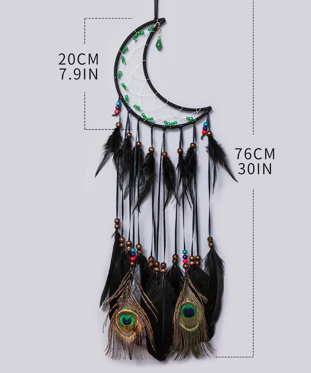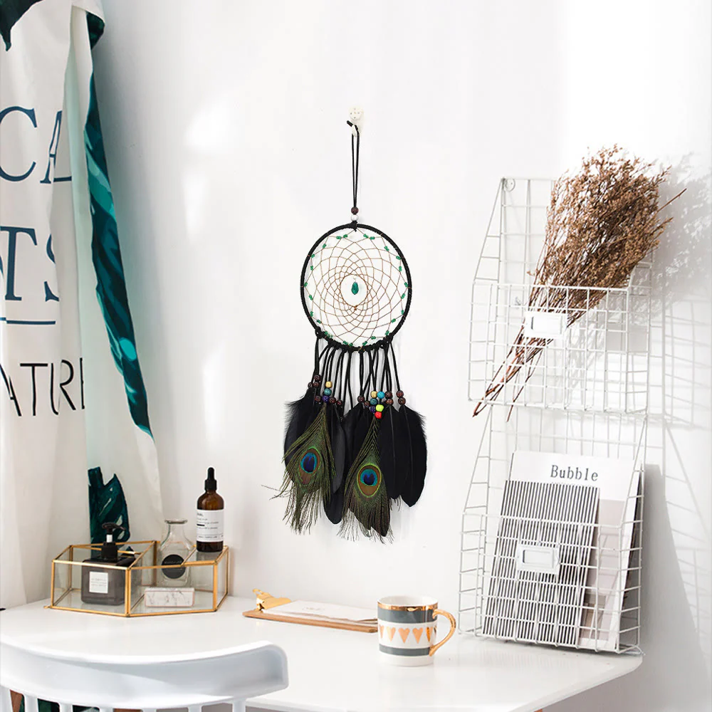 Attrape-rêves en plumes de paon fait main avec perles phosphorescentes Olivenorma