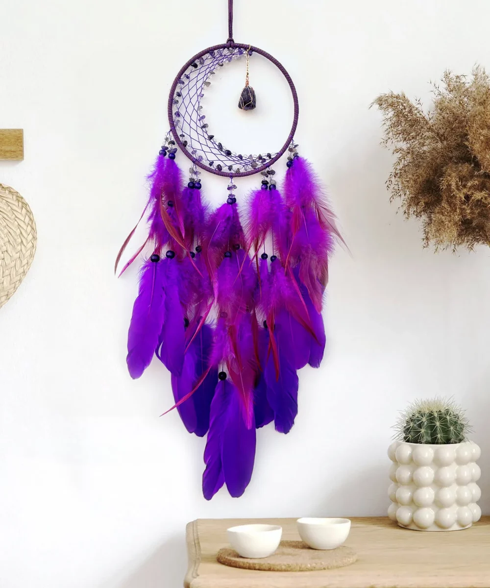 Attrape-rêves indien en forme de croissant avec pierres précieuses brutes et plumes