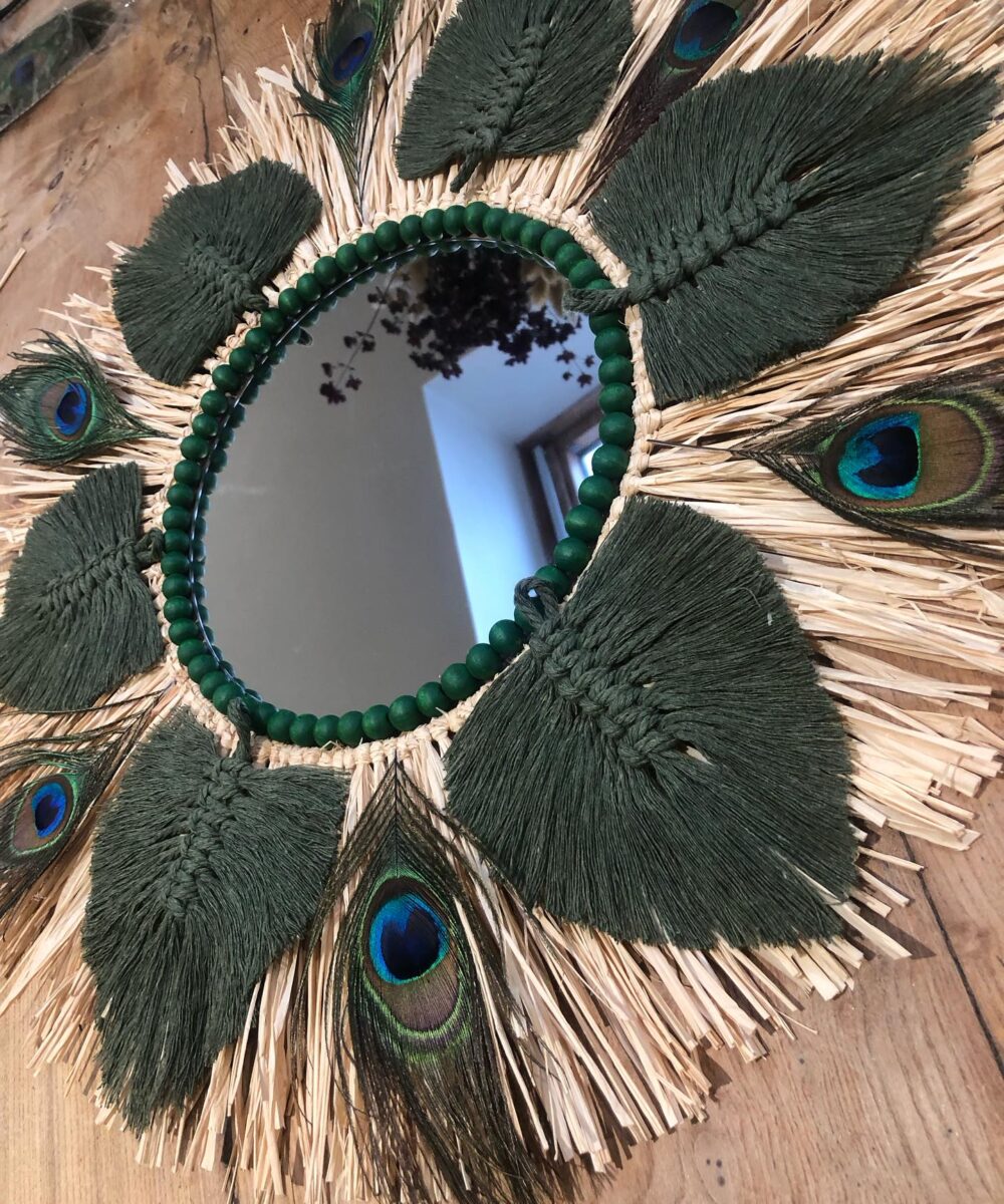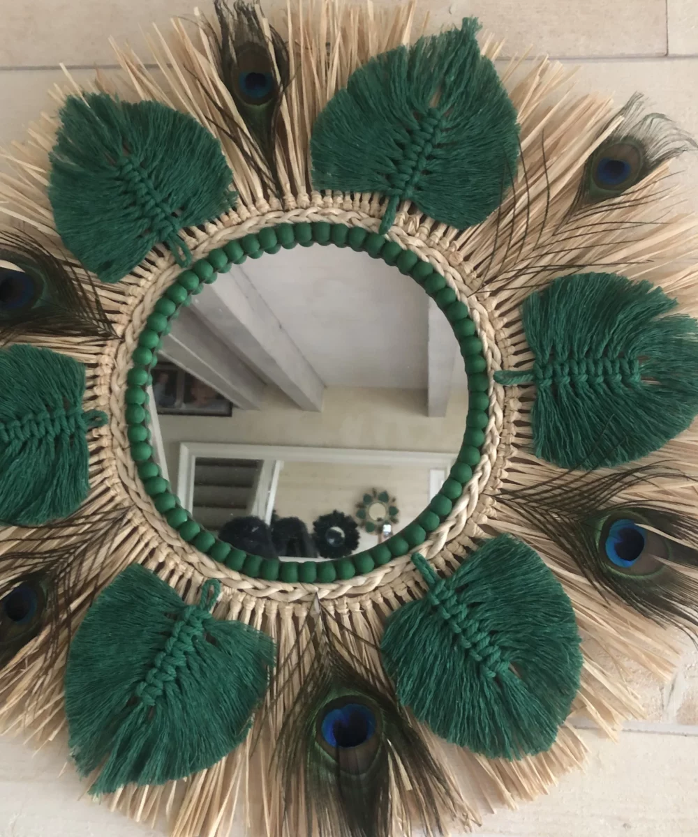 miroir en raphia, coton macramé et plumes de paon 50 cm