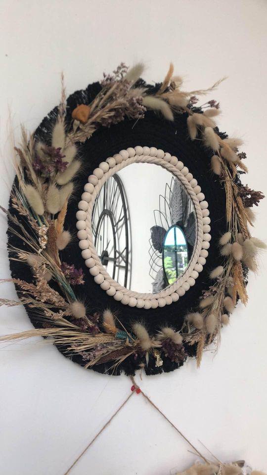 Miroir champêtre en macramé blanc et fleurs sechées.
