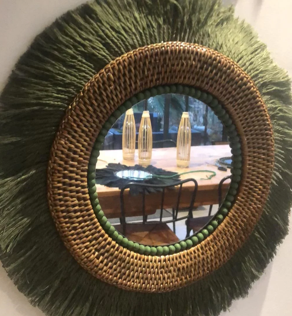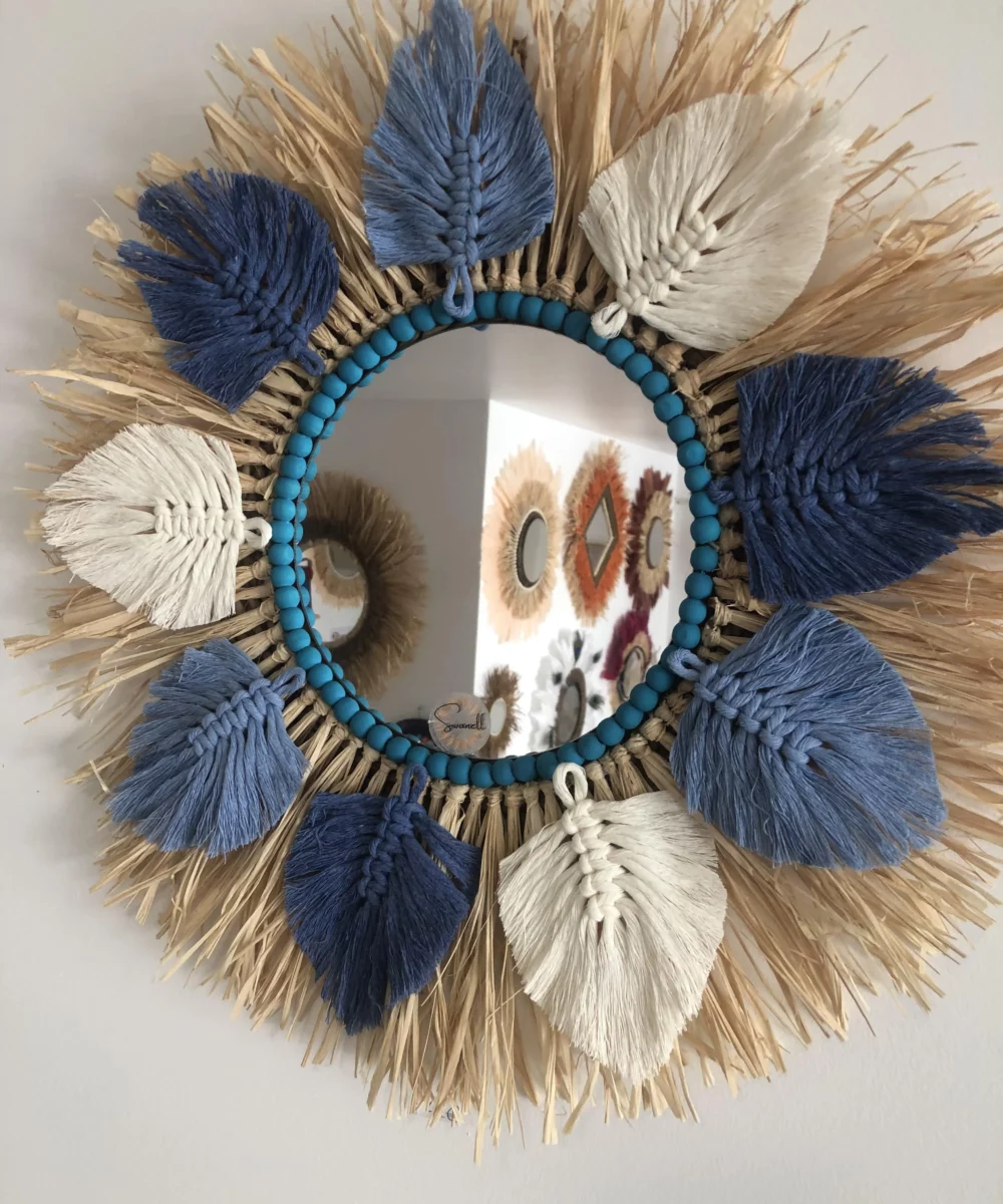 Miroir en raphia naturel et feuilles en coton macramé (différents coloris au choix)