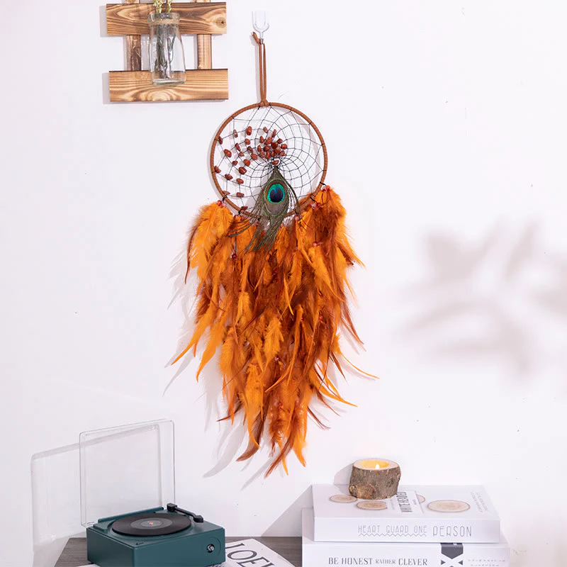 Attrape-rêves en agate rouge et turquoise avec plumes de paon Olivenorma
