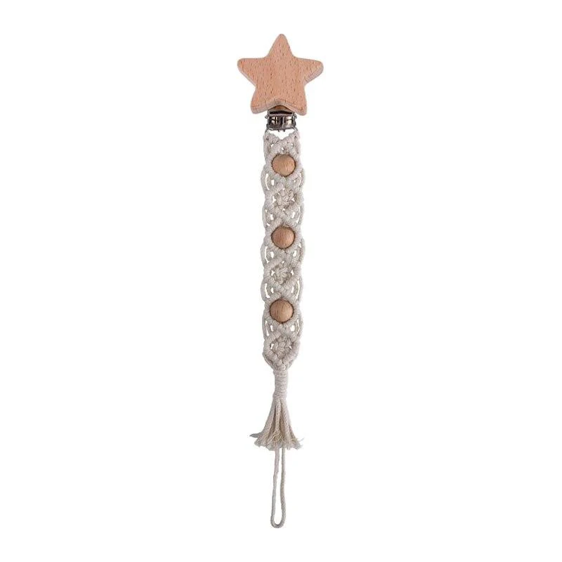Le crochet en métal, solide et durable, garantit que l’attache tétine reste fermement en place, assurant ainsi que la sucette de votre enfant soit toujours accessible et en sécurité. Idéal pour les sorties et les moments à la maison, cet attache sucette en coton et bois naturel est à la fois pratique et esthétique, rendant chaque journée plus facile pour les parents et plus agréable pour bébé.