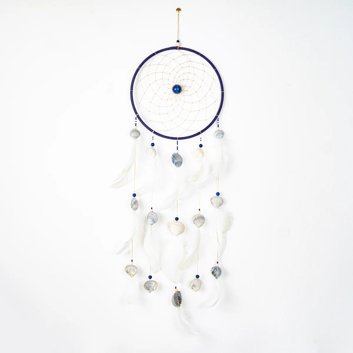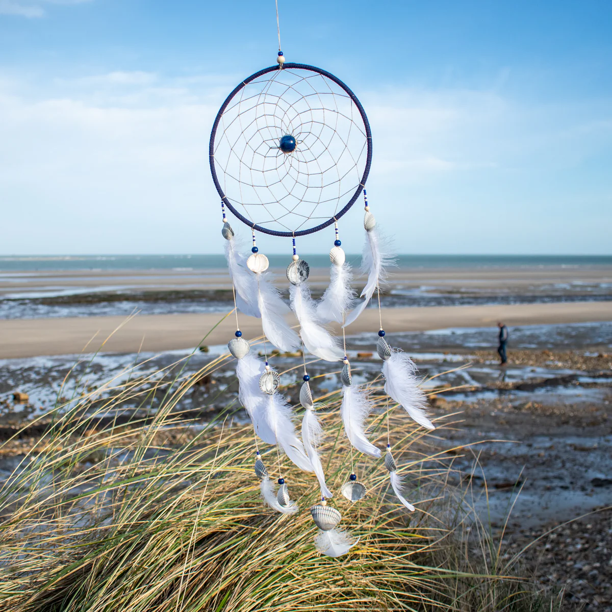 “Danse avec les coquillages” est un attrape-rêve marin confectionné à la main avec des coques blanches ramassées sur les plages de la Côte d’Opale (Wissant, Tardinghen, Équihen-plage).